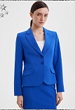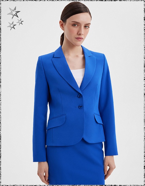 Слегка укороченный  жакет из поливискозной ткани в лазурно-синем цвете, приталенный, однобортный, английский воротник с широким лацканом, прорезные карманы с клапаном, круглый борт,  застежка на пуговицы, длинный втачной рукав, тонкие подплечники, модель на подкладке. Поливискозная ткань - смесовая ткань, в состав которой входят волокна вискозы и полиэстера. Гармоничное распределение прибавок на свободу облегания обеспечивают больше комфорта и удобства в носке.