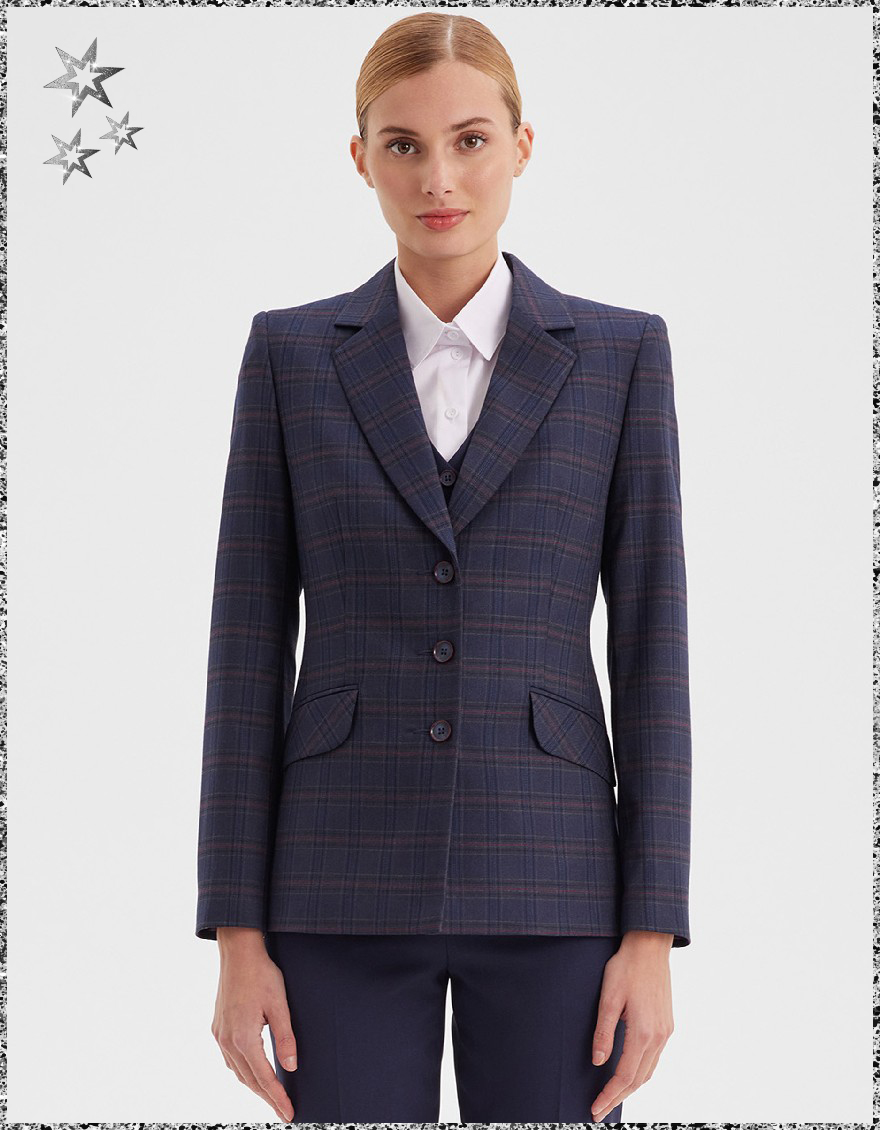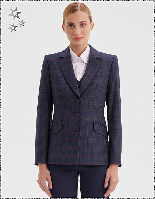 Универсальный жакет в клетку в классической и благородной цветовой гамме, которая идет всем, слегка удлиненный, приталенный, однобортный, английский воротник, прорезные карманы с клапаном, прямой борт, застежка на пуговицы, длинный втачной рукав, тонкие подплечники, модель на подкладке. Модель выполнена из поливискозной ткани - смесовая ткань, в состав которой входят волокна вискозы и полиэстера. Именно полиэстер придает ткани прочность, долговечность и опрятный внешний вид.