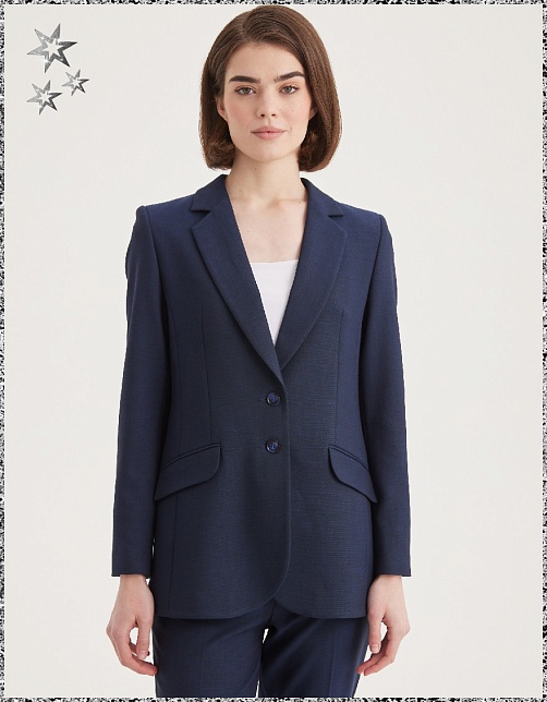 Жакет с особым лоском из фактурной ткани с мелким зернистым рисунком, который придает изделию особый вид, комфортная длина прикрывающая бедра, приталенный, однобортный, английский воротник, прорезные карманы с клапаном, круглый борт, застежка на пуговицы, сзади шлица, длинный втачной рукав с декоративной шлицей и рядом мелких пуговиц, тонкие подплечники, модель на подкладке в цвет пиджака. Фактура ткани - рельеф ее поверхности, который достигается использованием особого плетения.