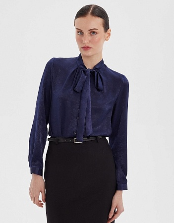 Короткий жакет в элегантном синем цвете из поливискозной ткани с мелкозернистым рисунком, придающий изделию дорогой вид и особый лоск, приталенный, однобортный, английский воротник, без карманов и лишнего декора, застежка на одну пуговицу, небольшой декоративный элемент в виде  разреза в среднем шве спинки придает изделию особый шарм и оригинальность, длинный втачной рукав с декоративной шлицей и рядом мелких пуговиц, тонкие подплечники, модель на подкладке в цвет изделия.
