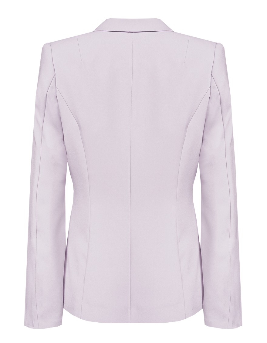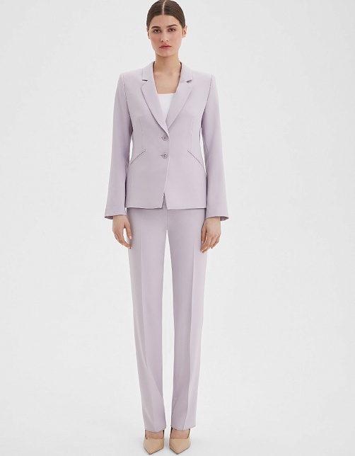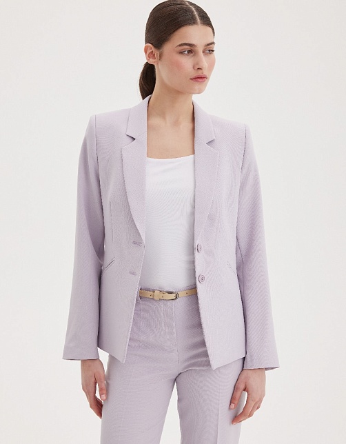 Легкий жакет с полуподкладкой из поливискозной ткани в пастельном оттенке бело-лилового цвета, средняя длина, приталенный, однобортный, английский воротник, прорезные карманы в рамку, прямой борт, застежка на пуговицы, длинный втачной рукав, тонкие подплечники, 1/2 подкладки. Полуподкладка или половина подкладки в пиджаке, это когда подкладочная ткань закрывает детали полочки, зону плеч и лопаток, а нижняя часть спинки остается без прикрытия. Такая модель обеспечит вам максимальный комфорт.