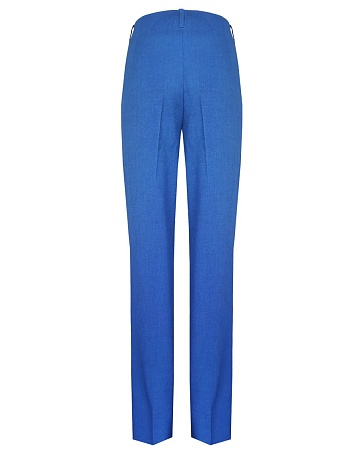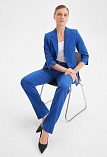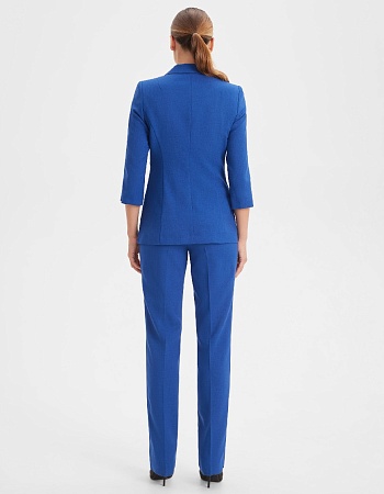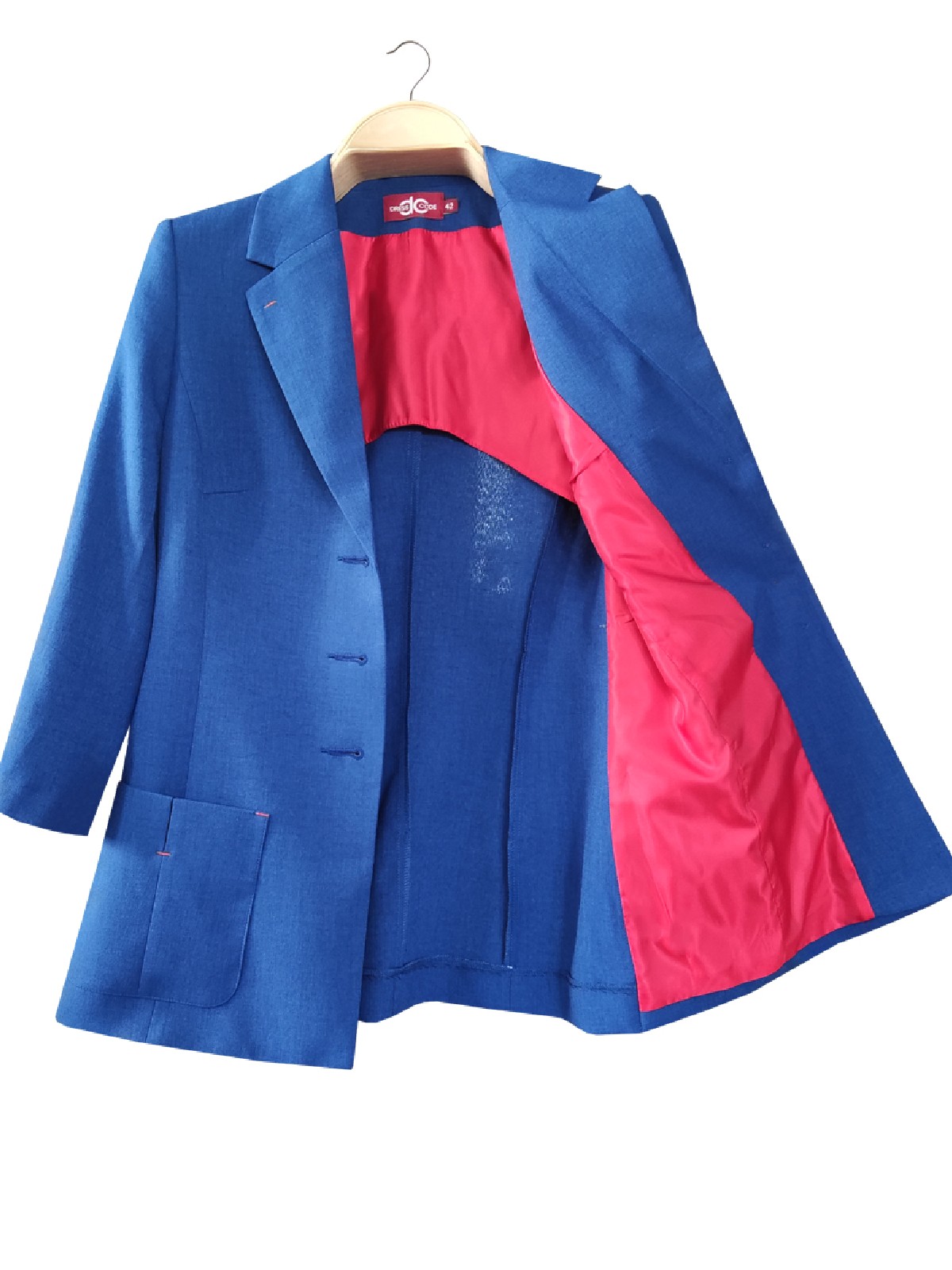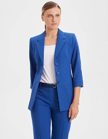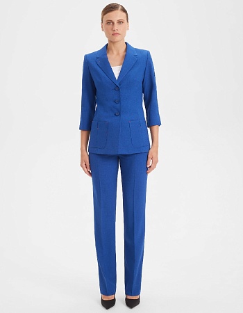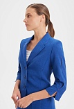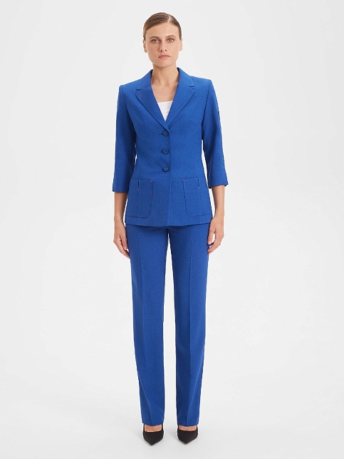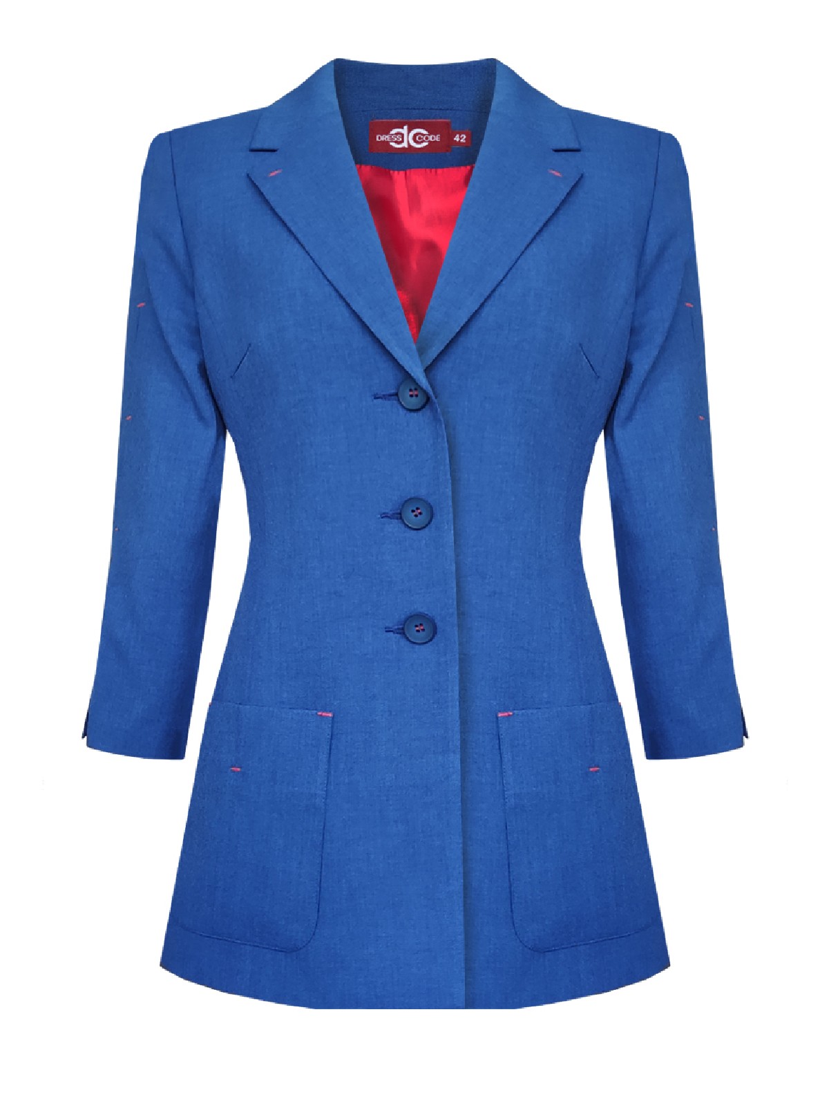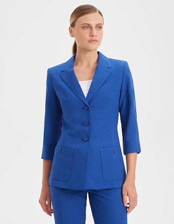 Легкий жакет синего цвета из смесовой ткани вишер льняной структуры с ярко-красной подкладкой только по полочке, средняя длина, приталенный, однобортный, английский воротник, накладные карманы со складкой, прямой борт, застежка на пуговицы, рукава длиной 3/4 с разрезами по центральному шву, на рукавах и карманах ярко-красные закрепки, модель с тонкими подплечниками, 1/2 подкладки. Ткань лен-вишер сохраняет свою натуральность, меньше мнется, ее легче гладить, в отличие от чистольняной ткани.