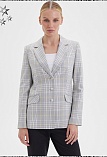 Универсальный жакет в клетку в спокойном сочетании серых оттенков из поливискозной ткани удобен в любое время года, слегка удлиненный, приталенный, однобортный, английский воротник, прорезные карманы с клапаном, прямой борт, застежка на пуговицы, длинный втачной рукав, тонкие подплечники, модель полностью на подкладке. Поливискозная ткань - смесовая ткань, в состав которой входят волокна вискозы и полиэстера. Именно полиэстер придает ткани прочность, долговечность и опрятный внешний вид.