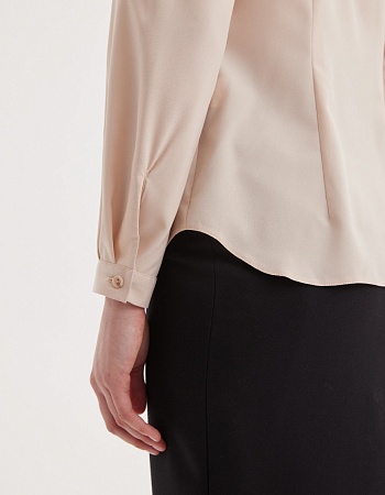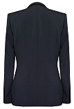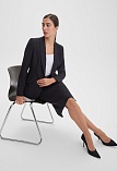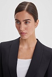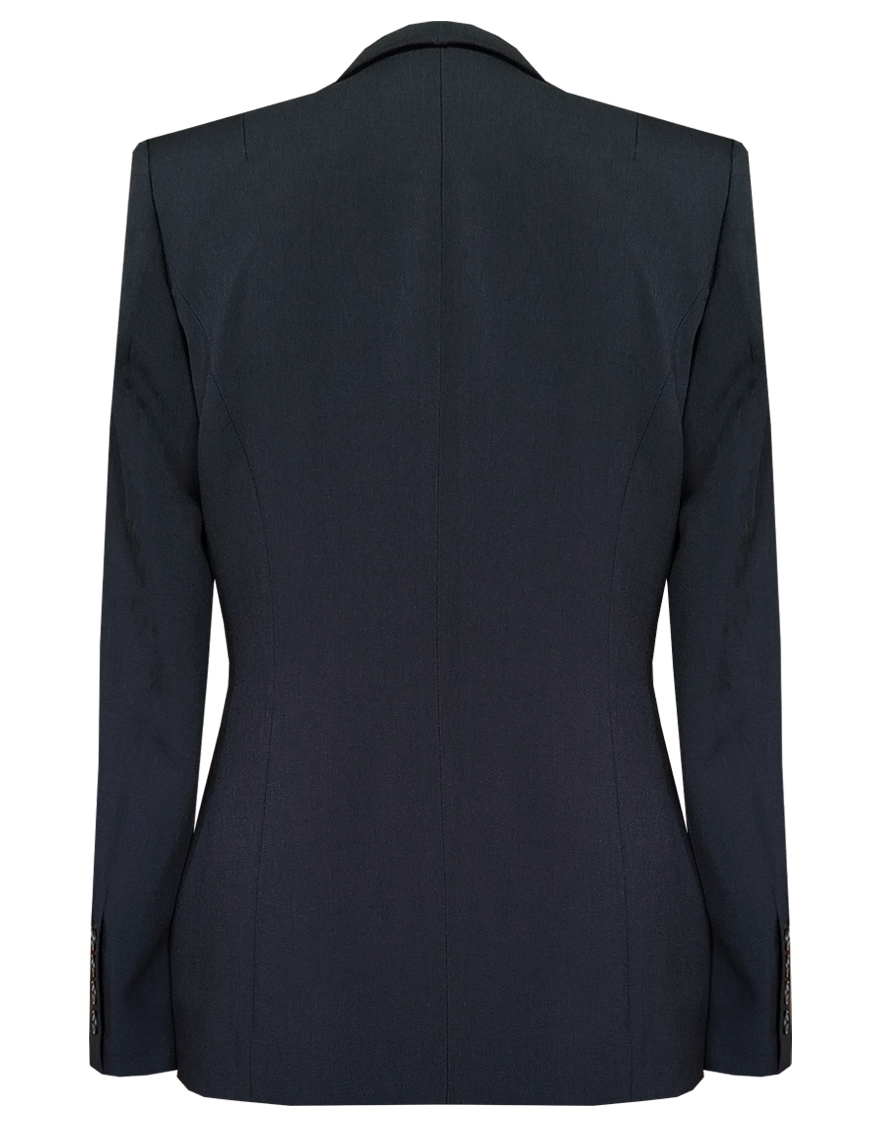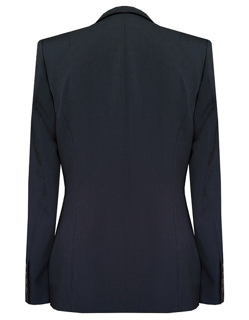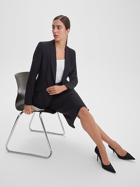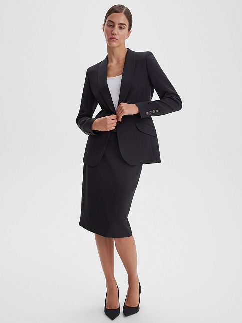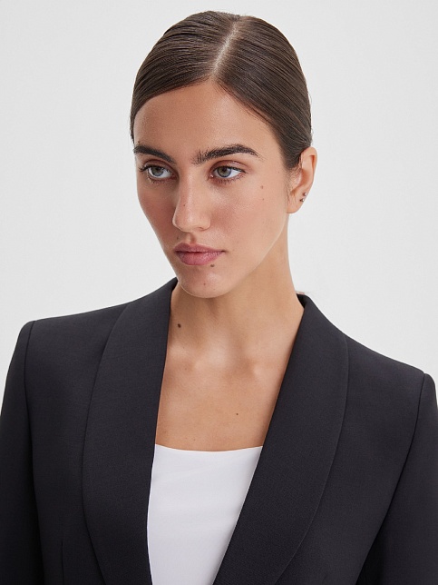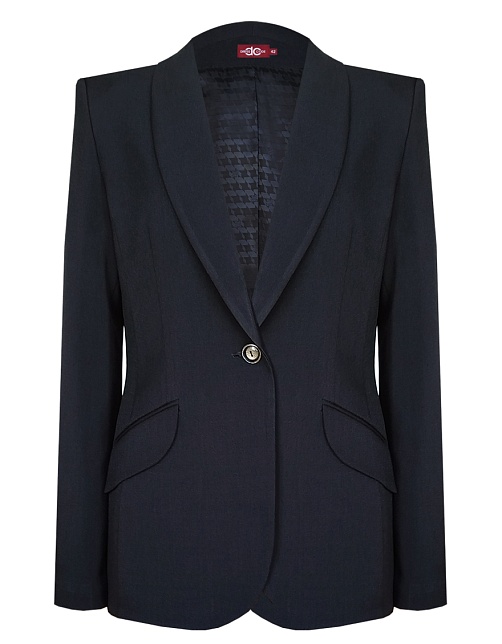Элегантный черный жакет из костюмной поливискозной ткани, средняя длина, приталенный, однобортный, воротник-шаль создает эффектный акцент, подчеркивая линию шеи и декольте, прорезные карманы с клапаном, круглый борт, застежка на одну пуговицу, длинный втачной рукав с декоративной шлицей и рядом мелких пуговиц, тонкие подплечники, модель на подкладке черного цвета. Поливискозная ткань - смесовая ткань, в состав которой входят волокна вискозы и полиэстера.