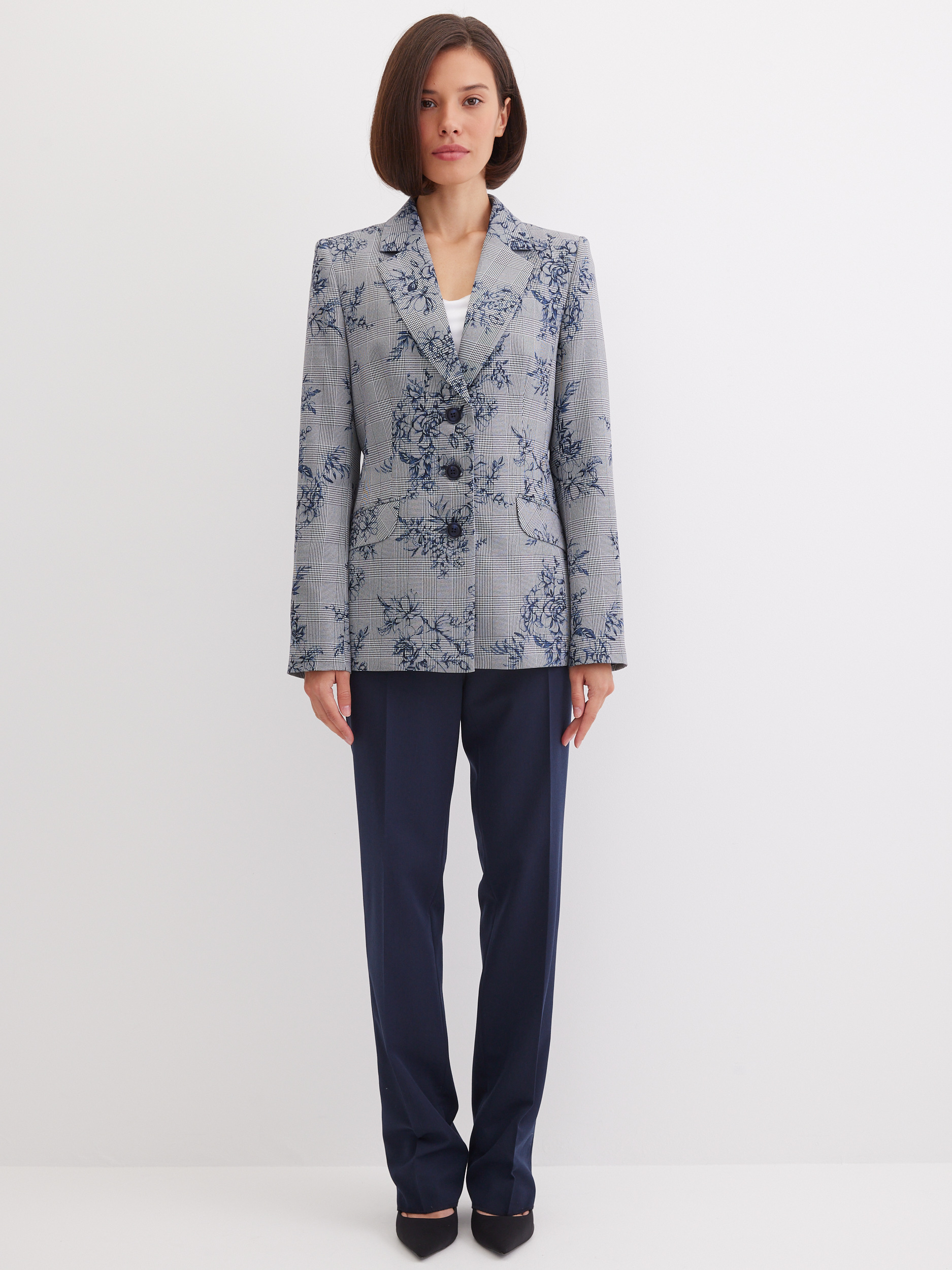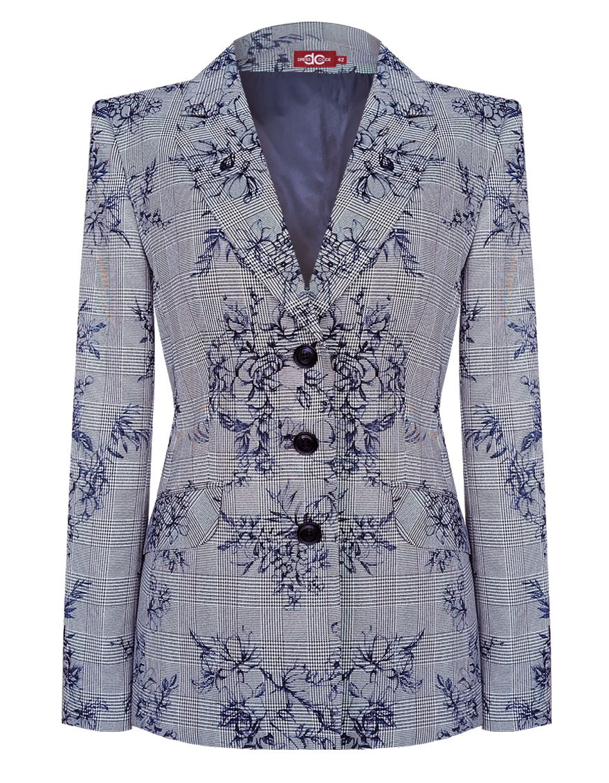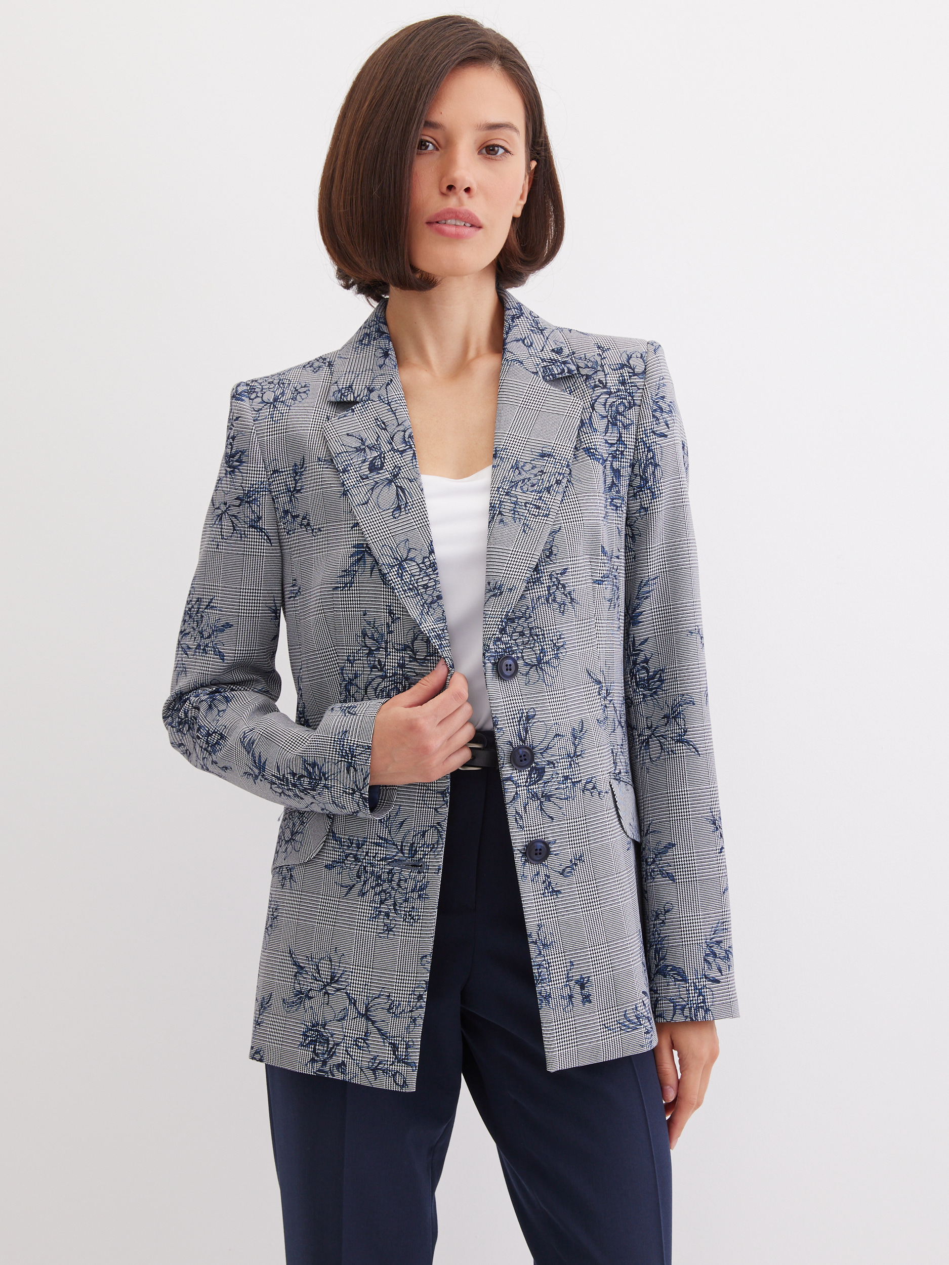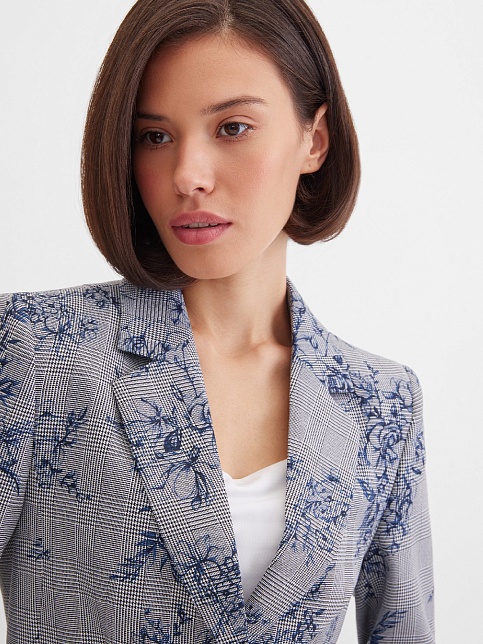 Классический жакет с гармоничным сочетанием крупного цветочного узора на традиционной клетке гленчек создает интересный и необычный визуальный эффект, выглядит более смело и экстравагантно. Средняя длина, приталенный, однобортный, английский воротник, прорезные карманы с клапаном, прямой борт, застежка на пуговицы, длинный втачной рукав, тонкие подплечники, модель на подкладке. Модель выполнена из премиальной костюмной ткани с эстетическим внешним видом и уникальными свойствами.