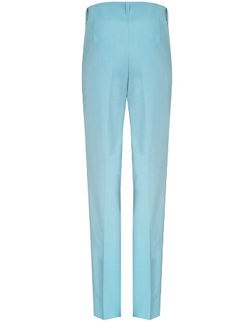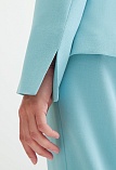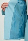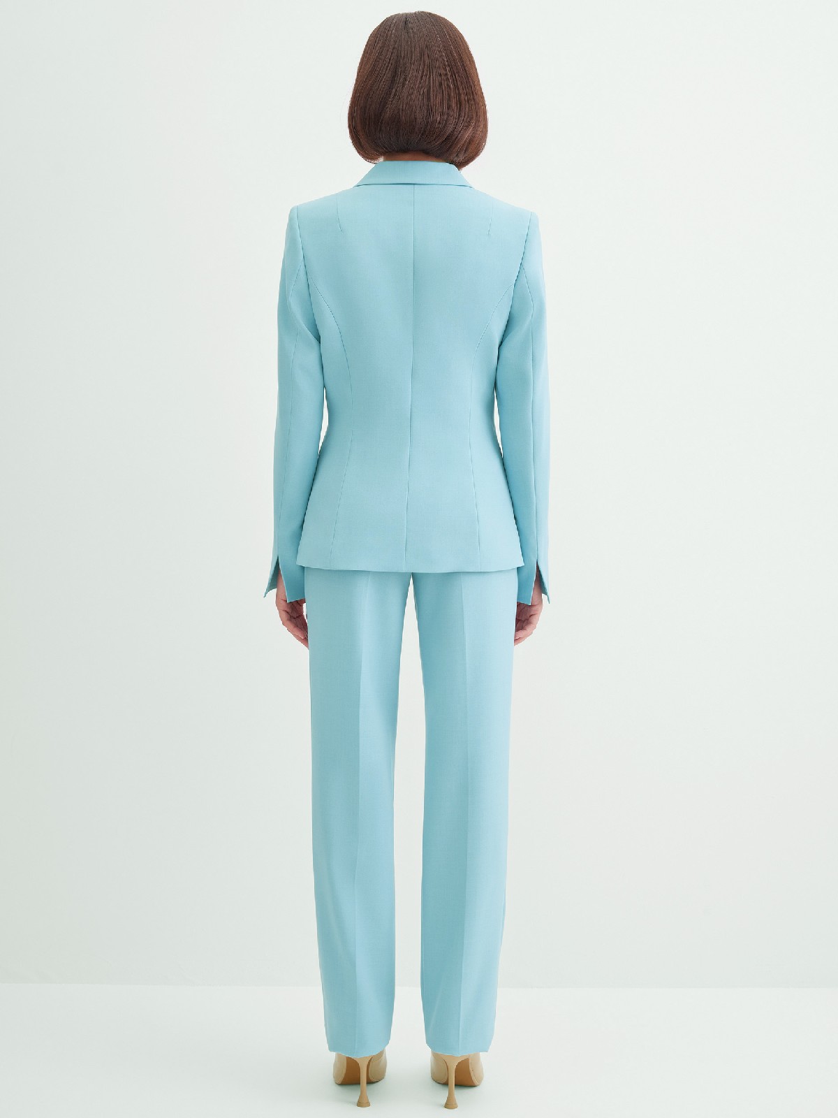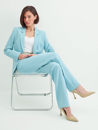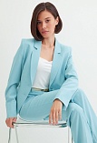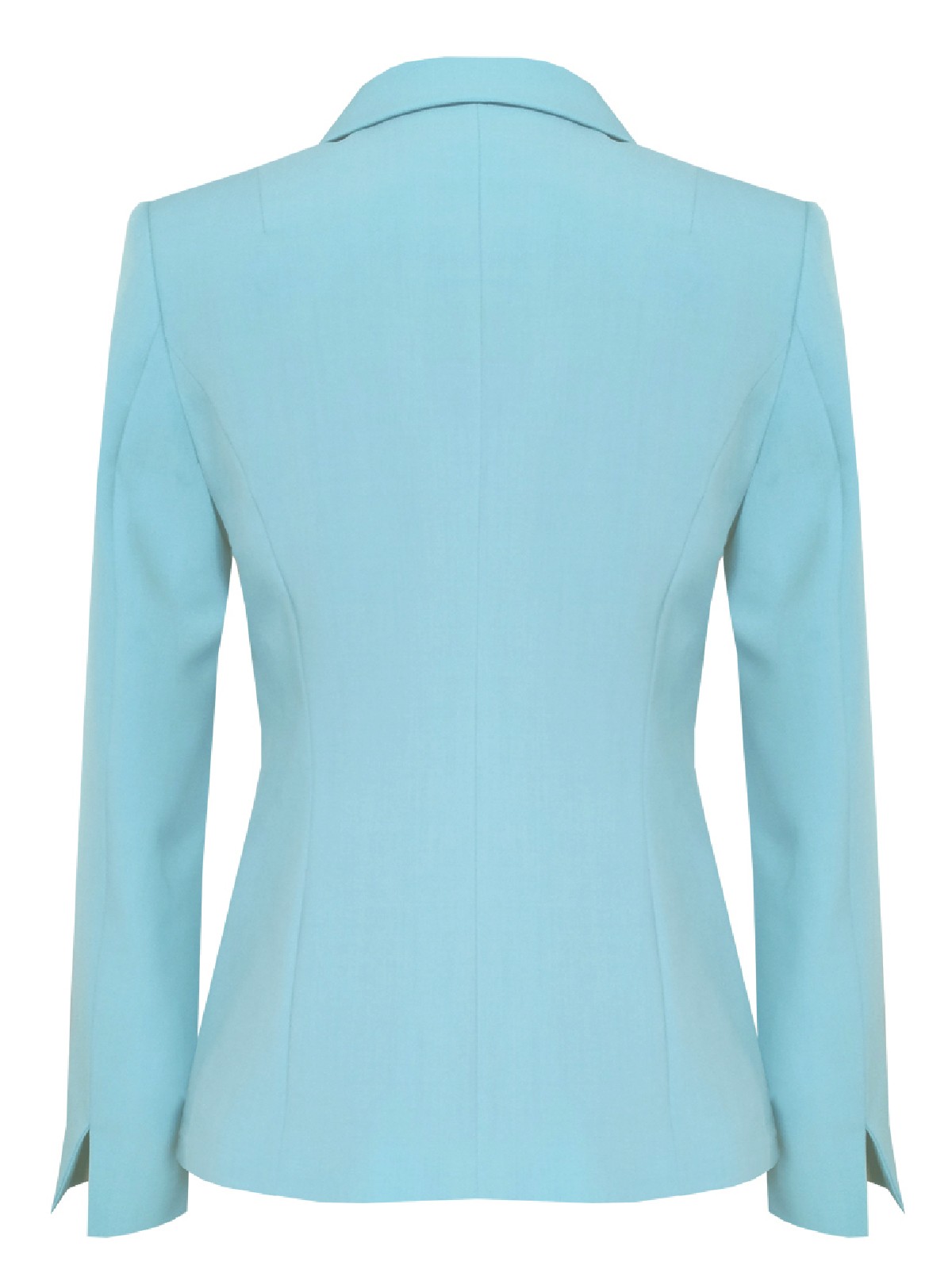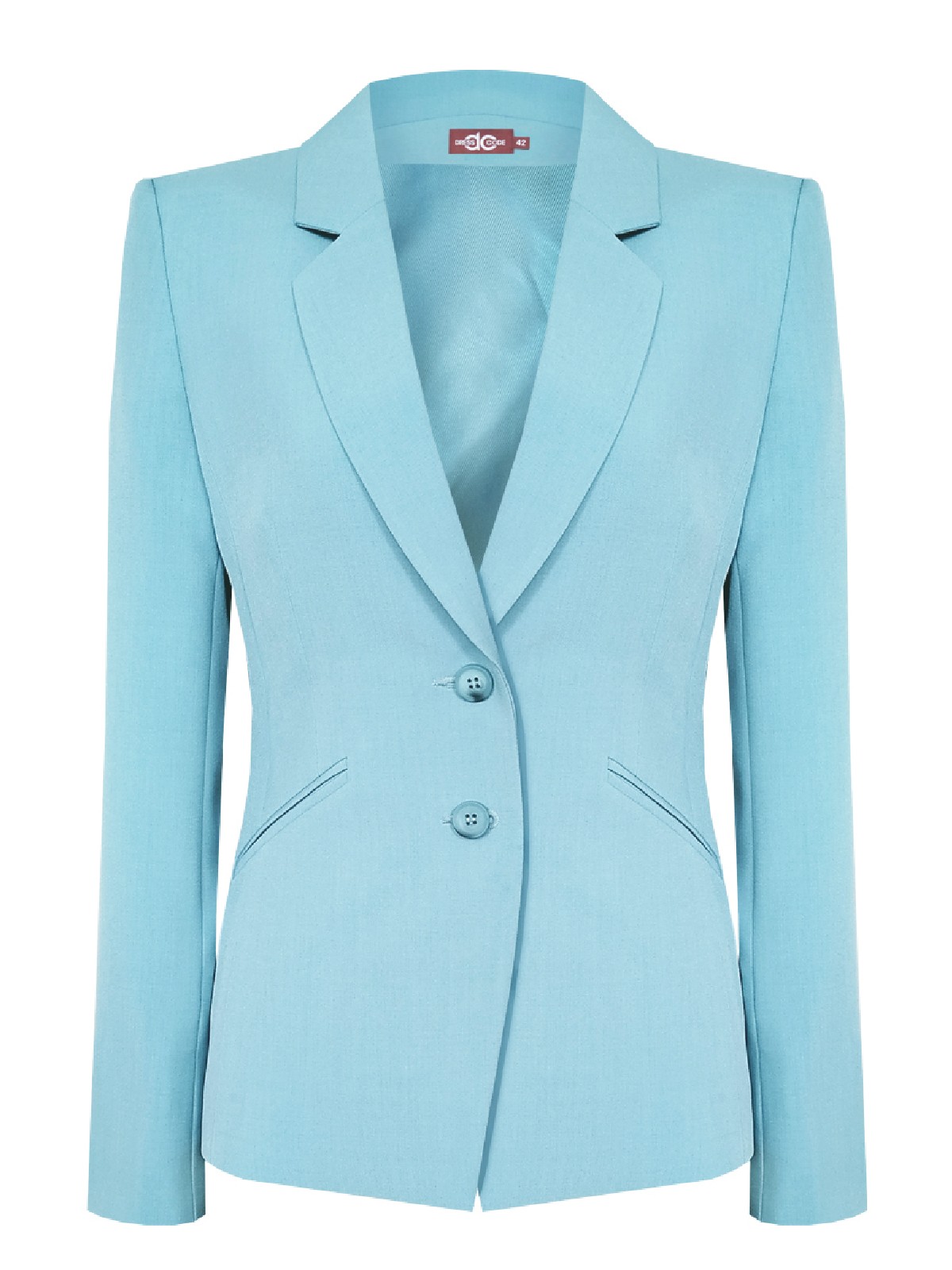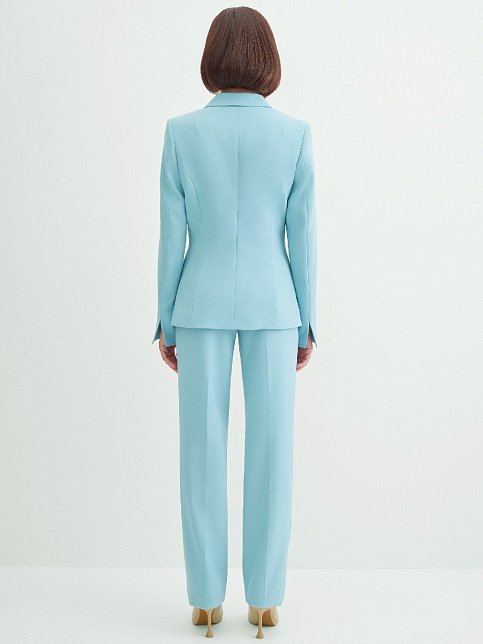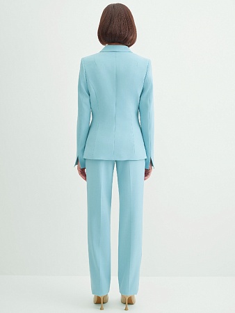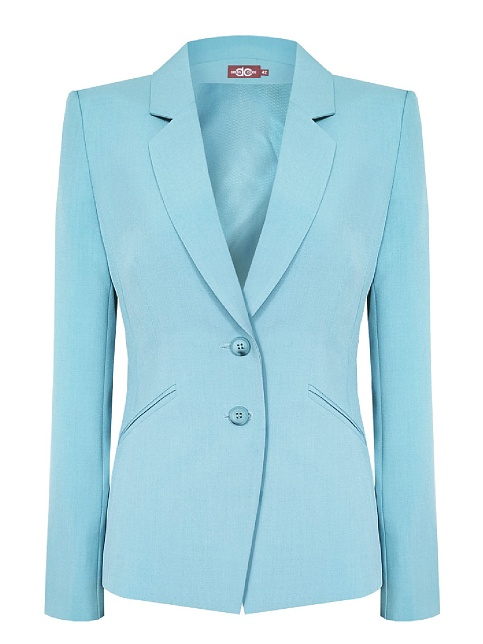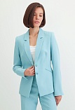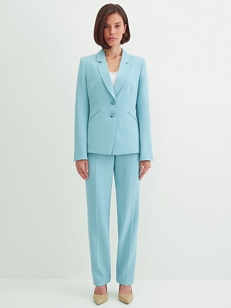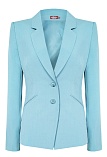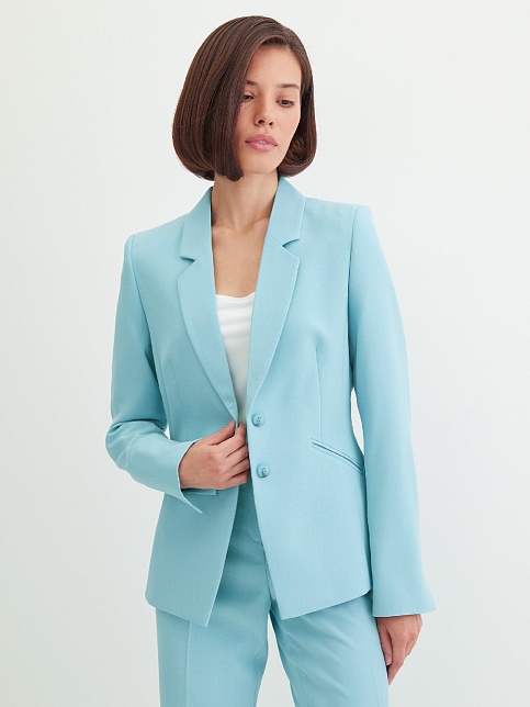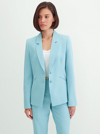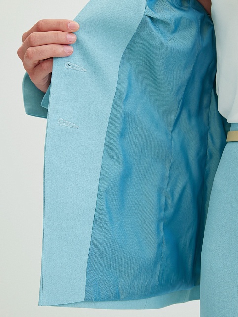 Жакет из поливискозной ткани в пастельно-бирюзовом цвете выглядит нежно и освежающе, средняя длина, приталенный, однобортный, английский воротник, прорезные карманы в рамку выполнены под наклоном, прямой борт, застежка на пуговицы, длинный втачной рукав с разрезом, который можно отвернуть, тем самым укоротив его длину, тонкие подплечники, модель на подкладке. Поливискозная ткань - это смесовая ткань, в состав которой входят волокна вискозы и полиэстера. Ткань практически не подвержена истиранию