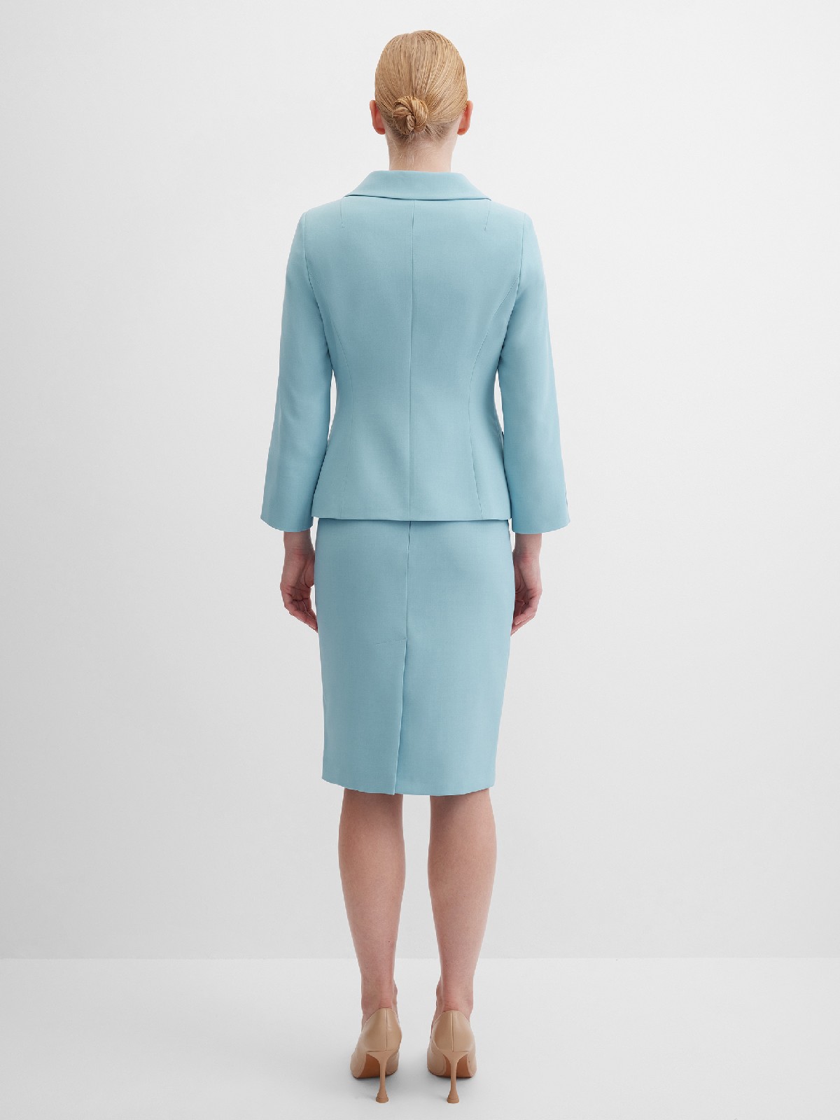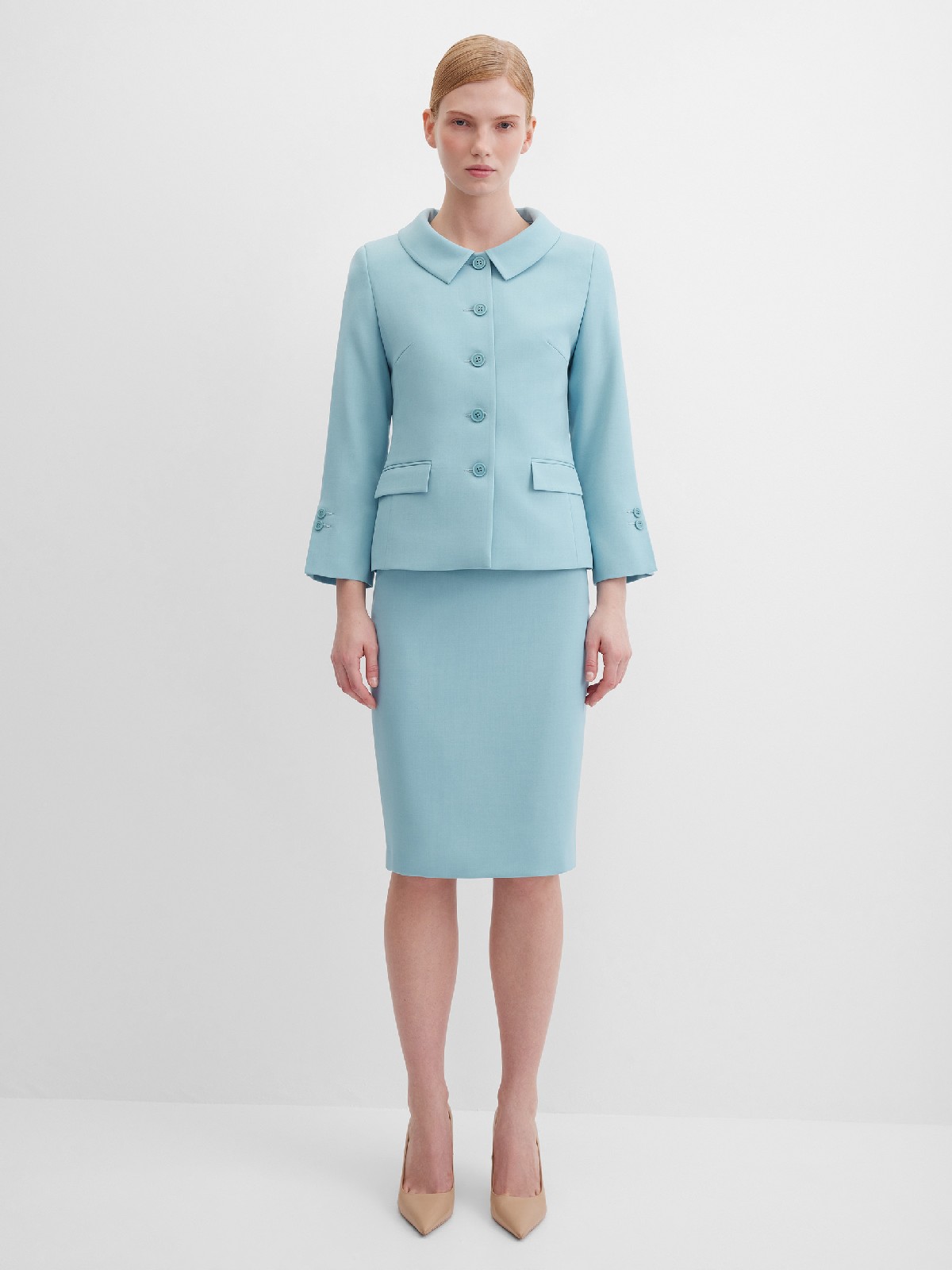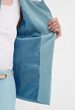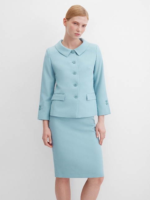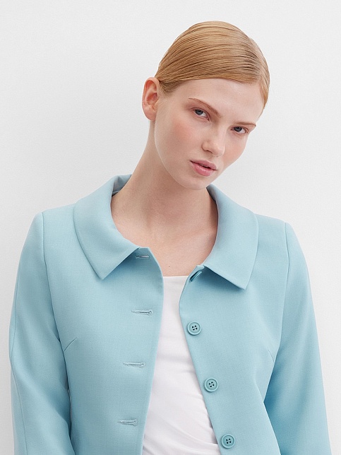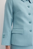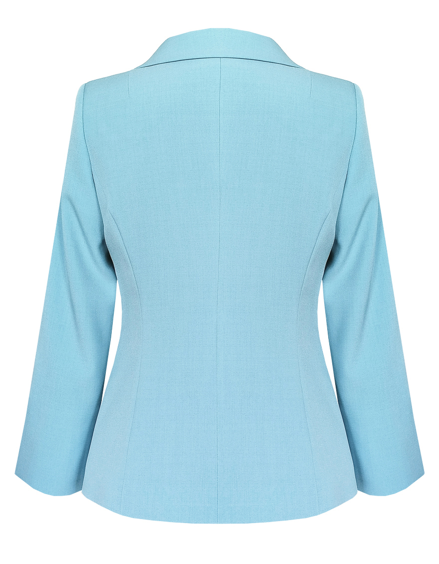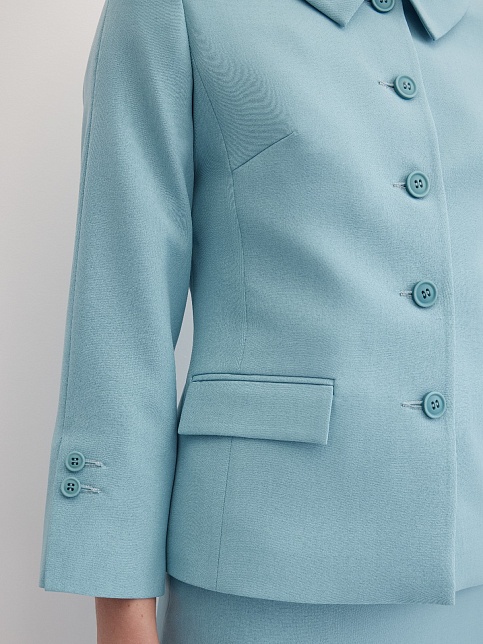 Элегантный жакет из поливискозной ткани в пастельно-бирюзовом цвете выглядит нежно и освежающе, приталенный, однобортный, расширенная горловина с отложным воротником подчеркивает изящность шеи, прорезные карманы с клапаном, прямой борт, застежка на пуговицы, втачной рукав 7/8 с декоративной шлицей и рядом мелких пуговиц, тонкие подплечники, модель на подкладке. Поливискозная ткань - смесовая ткань, в состав которой входят волокна вискозы и полиэстера.