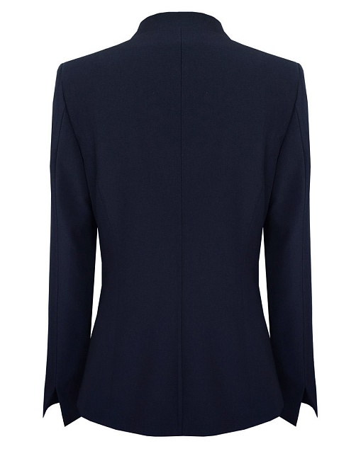 Жакет темно-синего цвета из поливискозной ткани, средняя длина, приталенный, однобортный, на спинке и полочке фигурные рельефы, воротник стойка, прорезные карманы с клапаном, застежка на одну пуговицу, длинный втачной рукав с разрезом, который позволяет менять длину рукава, тонкие подплечники, модель на жаккардовой подкладке синего цвета с рельефным выразительным узором. Поливискозная ткань - смесовая ткань, в состав которой входят волокна вискозы и полиэстера.