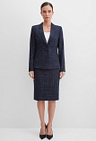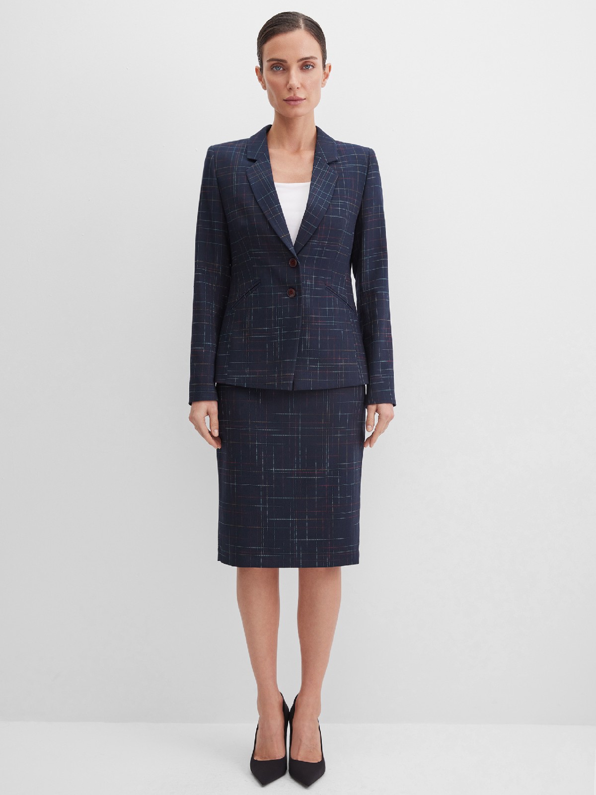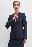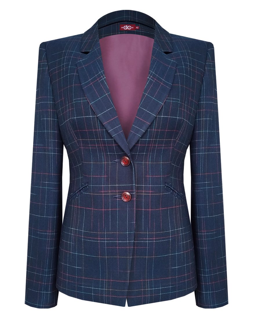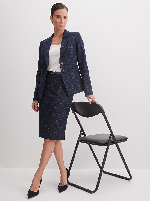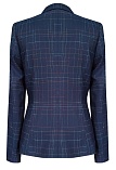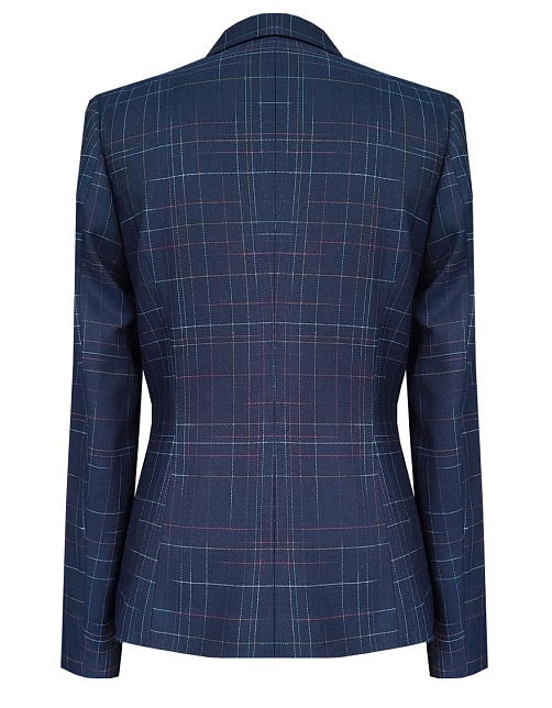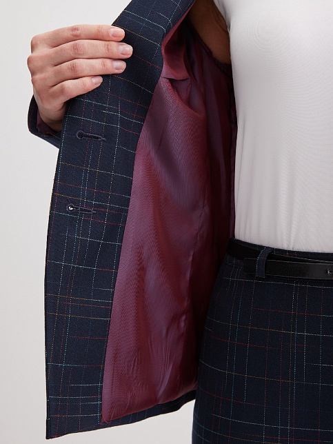 Классический жакет темно-синего цвета из поливискозной ткани в тонкую, почти незаметную разноцветную клетку, средняя длина, приталенный, однобортный, английский воротник, прорезные карманы в рамку выполнены под наклоном, прямой борт, застежка на пуговицы, длинный втачной рукав, тонкие подплечники, модель на подкладке. Благодаря увеличенным прибавкам на свободу облегания и их гармоничному распределению, модель подходит для всех типов фигур, идеальная посадка рукава для полных рук.