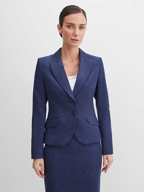 Слегка укороченный жакет в красивом синем цвете из мягкой и пластичной вельветовой ткани в мелкий  рубчик, по своей структуре напоминающий бархат, приталенный, однобортный, английский воротник с широким лацканом, прорезные карманы с клапаном, круглый борт, застежка на пуговицы, длинный втачной рукав, тонкие подплечники, модель на подкладке. Гармоничное распределение прибавок на свободу облегания обеспечивают больше комфорта и удобства в носке.