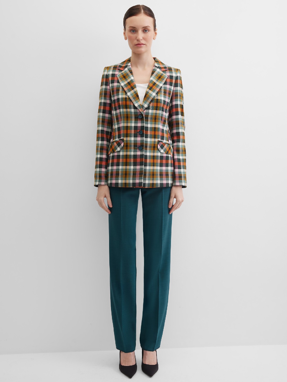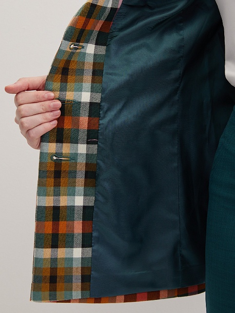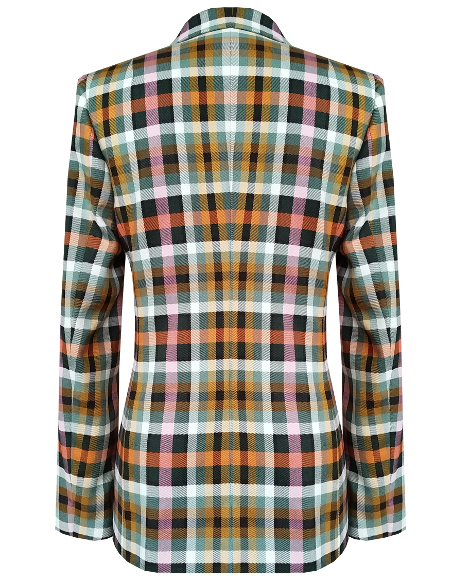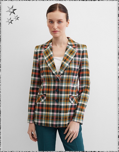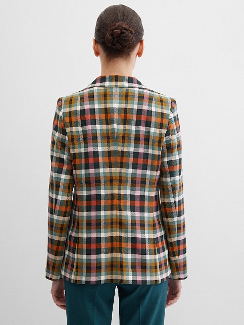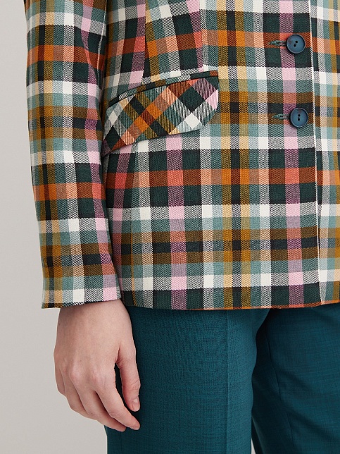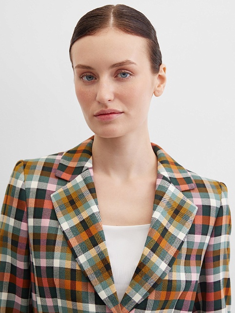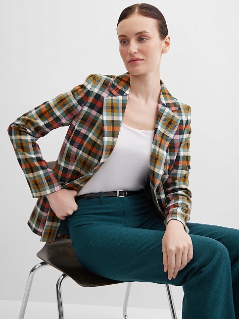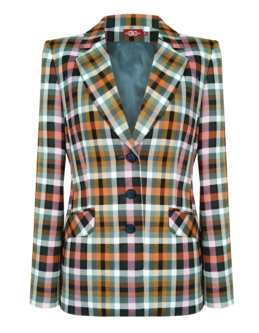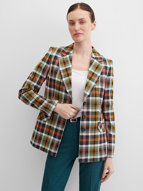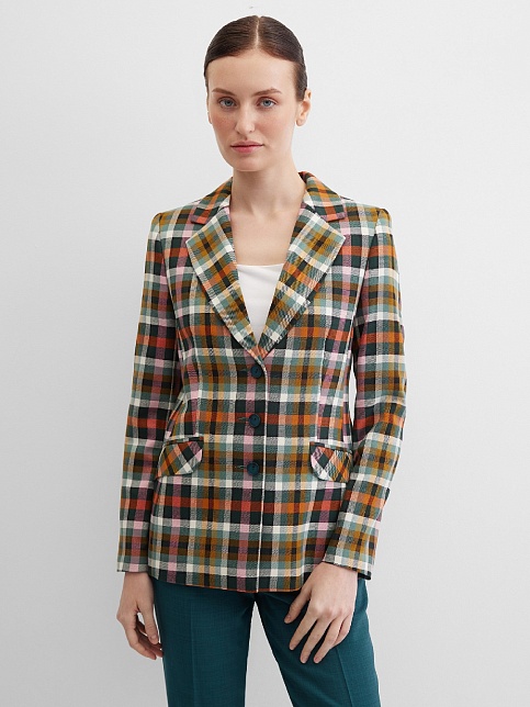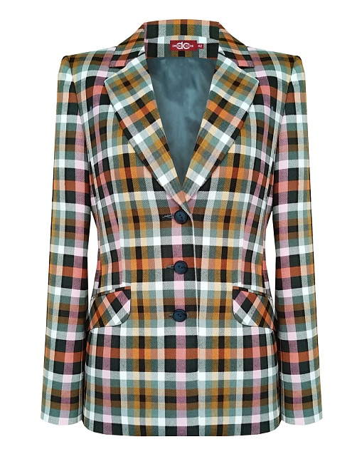 Модный классический жакет в клетку в энергичном и жизнерадостном цветовом сочетании - это символ стиля, универсальности и комфорта, такая модель  привлекает внимание, создавая образ уверенности и силы, слегка удлиненный, приталенный, однобортный, английский воротник, прорезные карманы с клапаном, прямой борт, застежка на пуговицы, длинный втачной рукав, тонкие подплечники, модель на подкладке. Комфортная посадка на любой размер. Модель выполнена из премиальной смесовой ткани.
