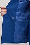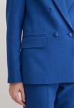 Двубортный жакет из поливискозной ткани в насыщенно синем цвете, слегка удлиненный, умеренный объем за счет легкого приталивания, английский воротник, прорезные карманы с клапаном, прямой борт, застежка на пуговицы, длинный втачной рукав, удобная комфортная посадка за счет общего подкройного бочка у спинки и полки, тонкие подплечники, модель на подкладке. Поливискозная ткань - это смесовая ткань, в состав которой входят волокна вискозы и полиэстера. Ткань практически не подвержена истиранию.
