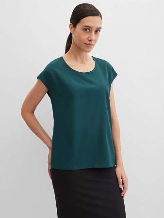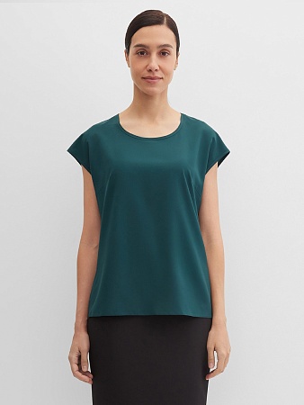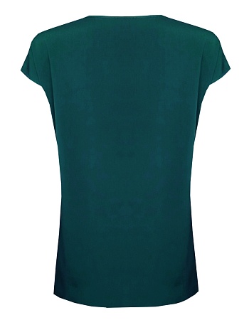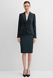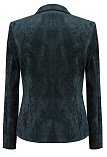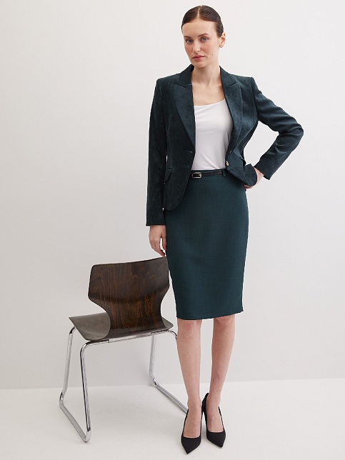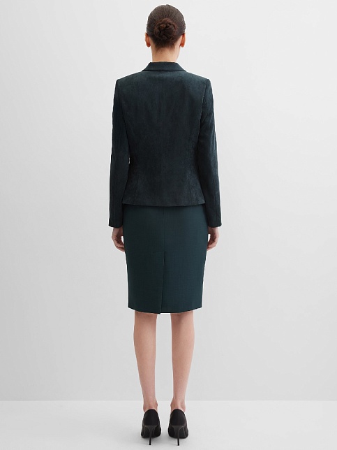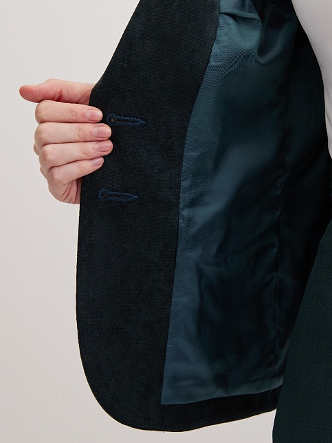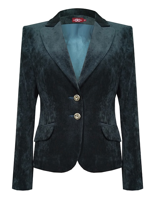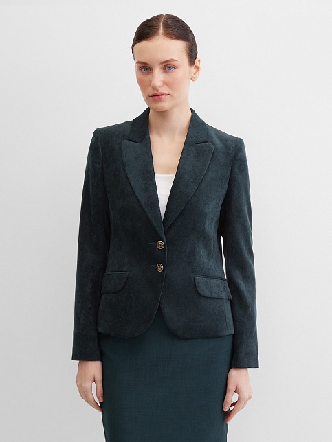 Слегка укороченный жакет в изысканном зеленом цвете из мягкой и пластичной велюровой ткани, по своей структуре напоминающий бархат, имеет характерный блеск и мягкие переливы, приталенный, однобортный, английский воротник с широким лацканом, прорезные карманы с клапаном, круглый борт, застежка на пуговицы, длинный втачной рукав, тонкие подплечники, модель на подкладке. Гармоничное распределение прибавок на свободу облегания обеспечивают больше комфорта и удобства в носке.