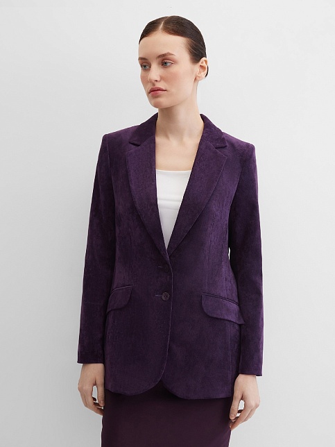 Жакет в классическом стиле в благородном фиолетовом цвете из роскошной и пластичной велюровой ткани, по своей структуре напоминающий бархат, имеет характерный блеск и мягкие переливы, комфортная длина прикрывающая бедра, приталенный, однобортный, английский воротник, прорезные карманы с клапаном, круглый борт, застежка на пуговицы, сзади шлица, длинный втачной рукав, тонкие подплечники, модель на подкладке. Комфортная модель на любой тип фигуры!
