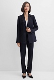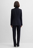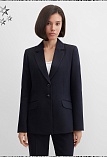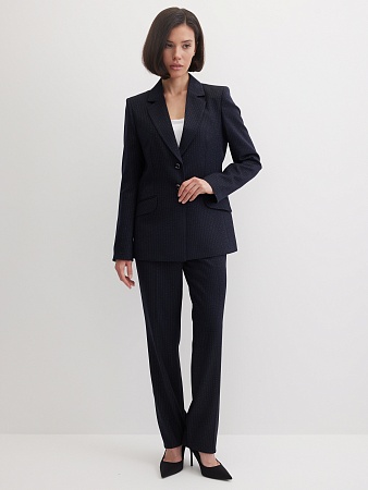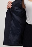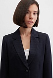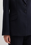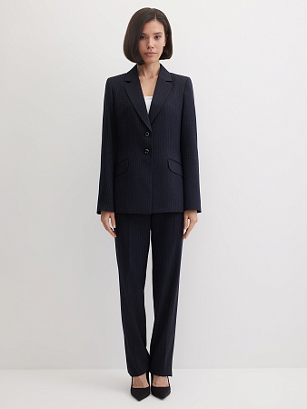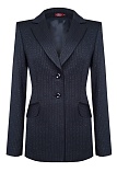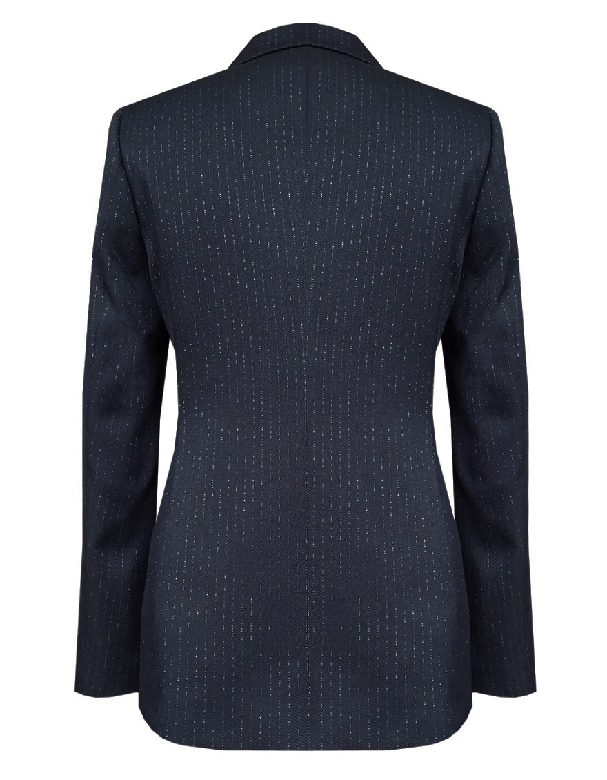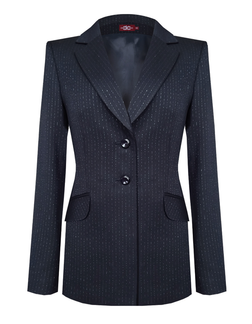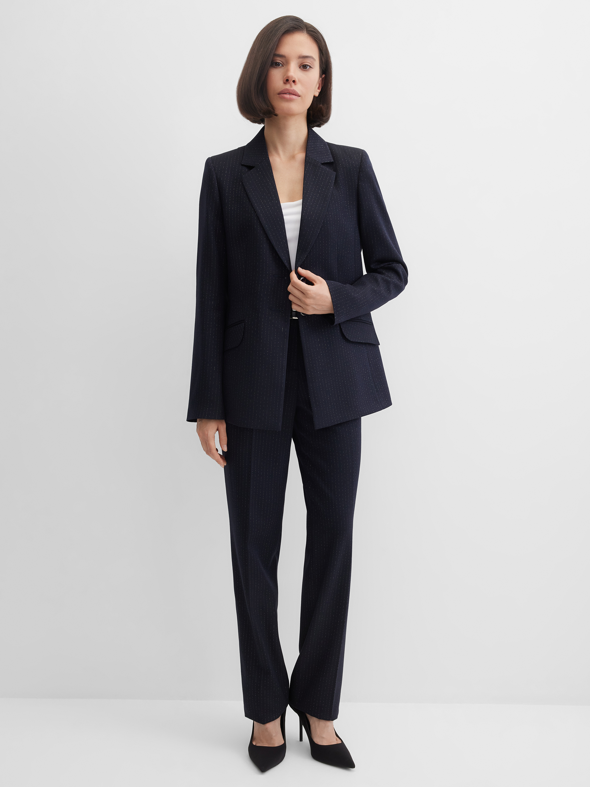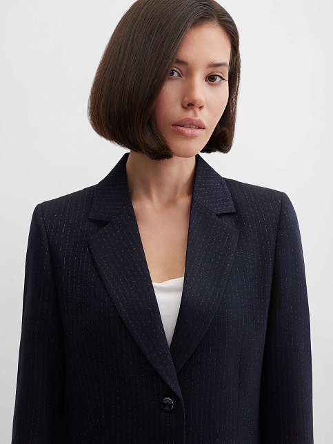 Нарядный темно-синий жакет из поливискозной ткани в мерцающую серебристую полоску с утонченным блеском, слегка удлиненный, приталенный, однобортный, английский воротник, прорезные карманы с клапаном, прямой борт, общий подкройной бочок у спинки и полочки без бокового шва, застежка на две пуговицы, длинный втачной рукав, тонкие подплечники, модель на подкладке. Жакет с легким мерцанием ассоциируется с торжественными мероприятиями.