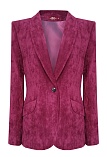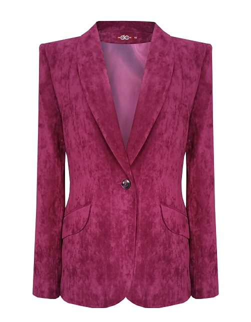 Элегантный жакет в роскошном и изысканном цвете бургунди из мягкой и пластичной вельветовой ткани в мелкий  рубчик, по своей структуре напоминающий бархат, средняя длина, приталенный, однобортный, воротник-шаль создает эффектный акцент, подчеркивая линию шеи и декольте, прорезные карманы с клапаном, круглый борт, застежка на одну пуговицу, длинный втачной рукав, тонкие подплечники, модель на подкладке. Идеальный вариант для торжественных встреч и мероприятий!