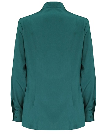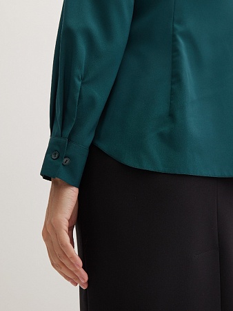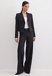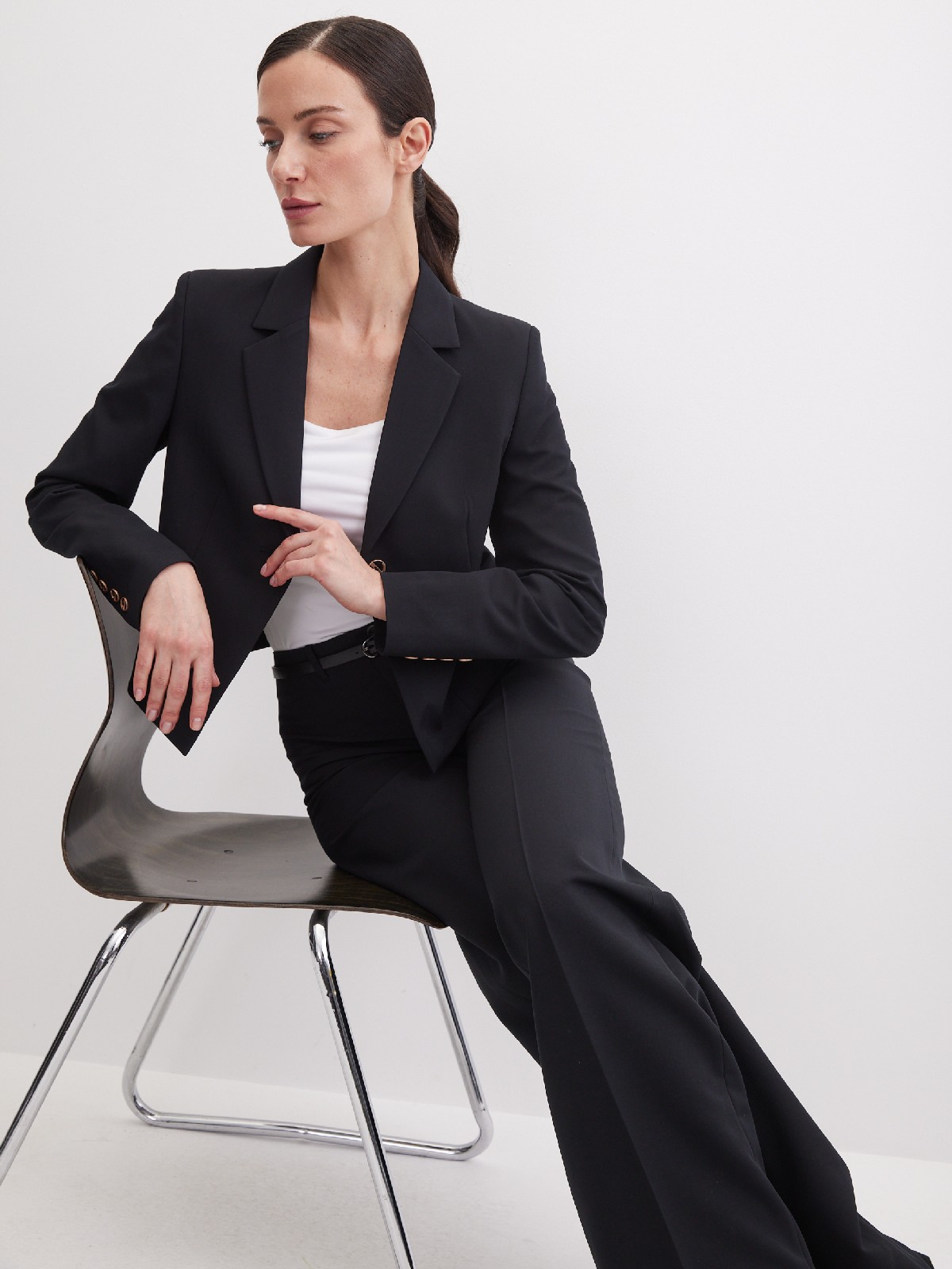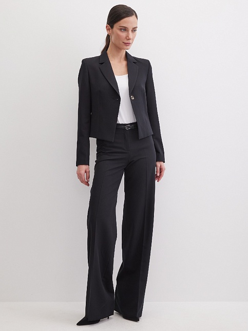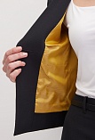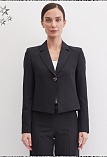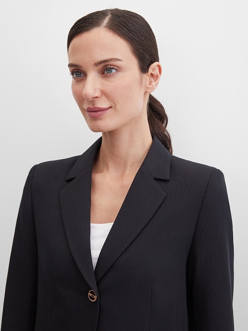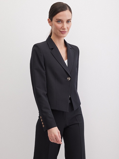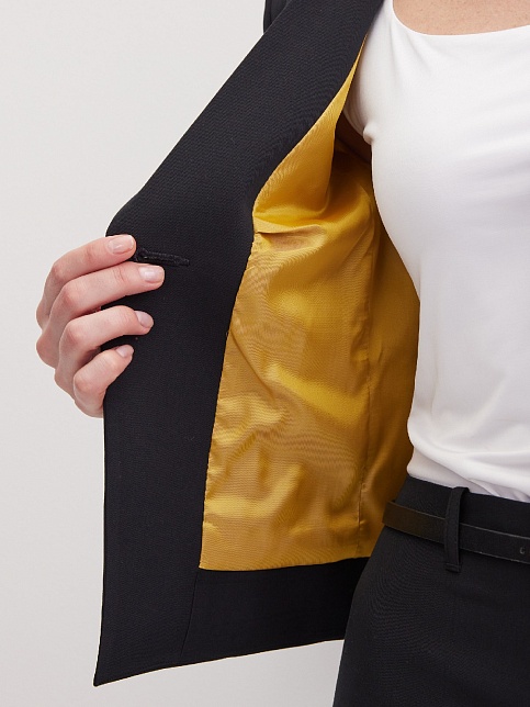 Короткий жакет в базовом черном цвете из поливискозной ткани, приталенный, однобортный, английский воротник, без карманов и лишнего декора, застежка на одну пуговицу, небольшой декоративный элемент в виде  разреза в среднем шве спинки придает изделию особый шарм и оригинальность, длинный втачной рукав с декоративной шлицей и рядом мелких пуговиц, тонкие подплечники, модель на подкладке золотистого цвета. Поливискозная ткань - смесовая ткань, в состав которой входят волокна вискозы и полиэстера.