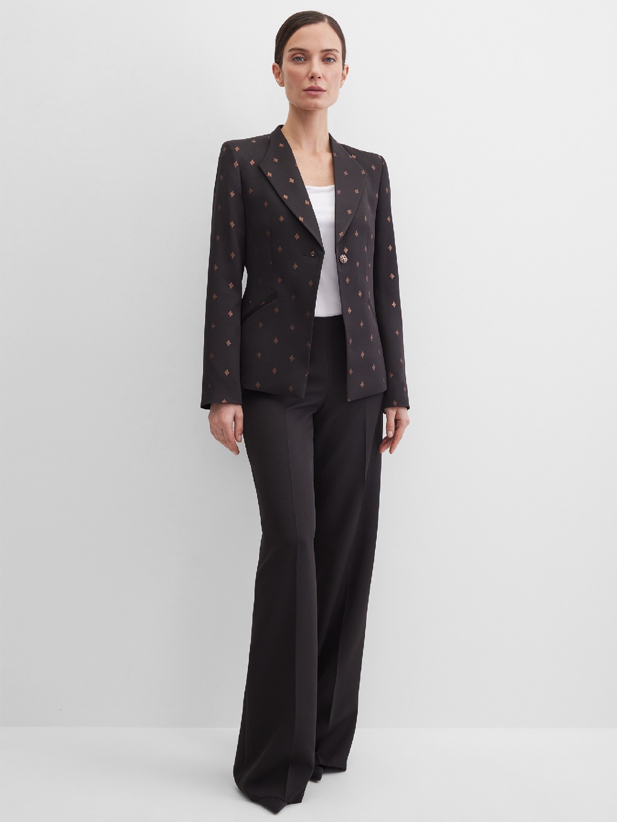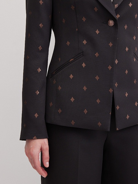 Роскошный черный жакет с золотистым ромбовидным узором из поливискозной ткани, средняя длина, приталенный, однобортный, оригинальный воротник "апаш" - разновидность воротника типа шалевого, прорезные карманы в рамку, прямой борт, застежка на одну пуговицу, длинный втачной рукав, тонкие подплечники, на подкладке черного цвета. Поливискозная ткань - смесовая ткань, в состав которой входят волокна вискозы и полиэстера. Строгий праздничный пиджак для торжественного дресс-кода!