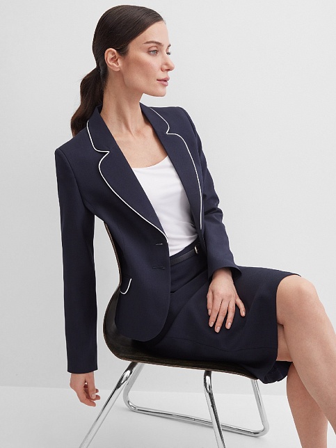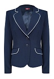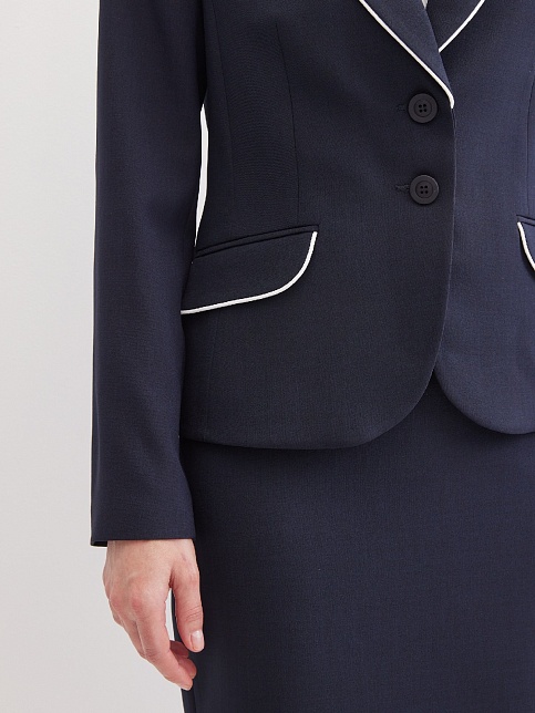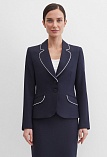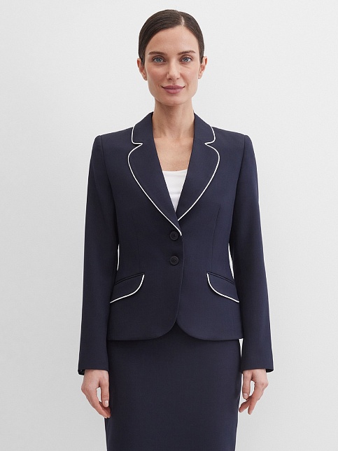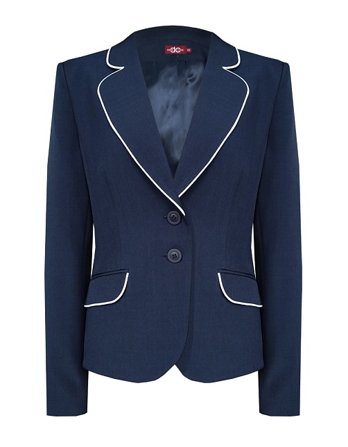 Слегка укороченный  жакет из смесовой ткани в благородном синем цвете с изящной отделкой из узкого белого канта по краю кармана и воротника, что придает изделию аккуратный и законченный вид, приталенный, однобортный, английский воротник, прорезные карманы с клапаном, круглый борт,  застежка на пуговицы, длинный втачной рукав, тонкие подплечники, модель полностью на подкладке.
