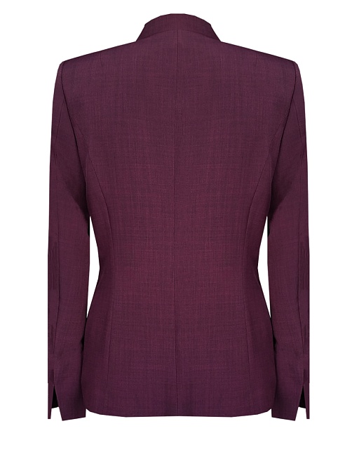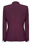 Жакет из костюмной поливискозной ткани в глубоком и насыщенном оттенке винного цвета, средняя длина, приталенный, однобортный, на спинке и полочке фигурные рельефы, небольшой воротник стойка плавно переходящий в линию борта, прорезные карманы с клапаном, застежка на одну пуговицу, длинный втачной рукав с разрезом, который позволяет менять длину рукава, его можно  отвернуь и тем самым укоротить длину или оставить в естественном положении, тонкие подплечники, модель на подкладке.