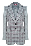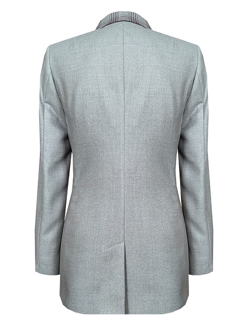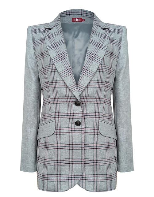 Классический жакет из поливискозной ткани серого цвета с акцентом на полочку, которая выполнена из ткани компаньона в клетку с актуальным сочетанием цветов, комфортная длина прикрывающая бедра, приталенный, однобортный, английский воротник, прорезные карманы с клапаном, круглый борт, застежка на пуговицы, сзади шлица, длинный втачной рукав, тонкие подплечники, модель на подкладке. Использование двух видов ткани придает изделию уникальность и позволяет адаптировать модель под разные случаи.