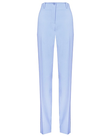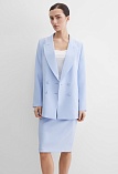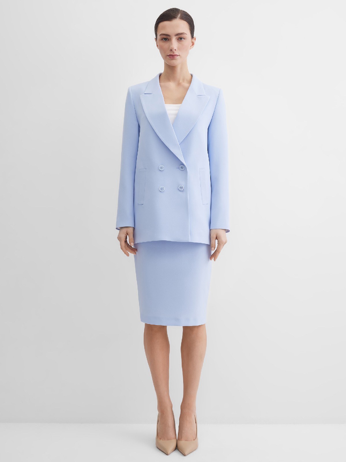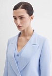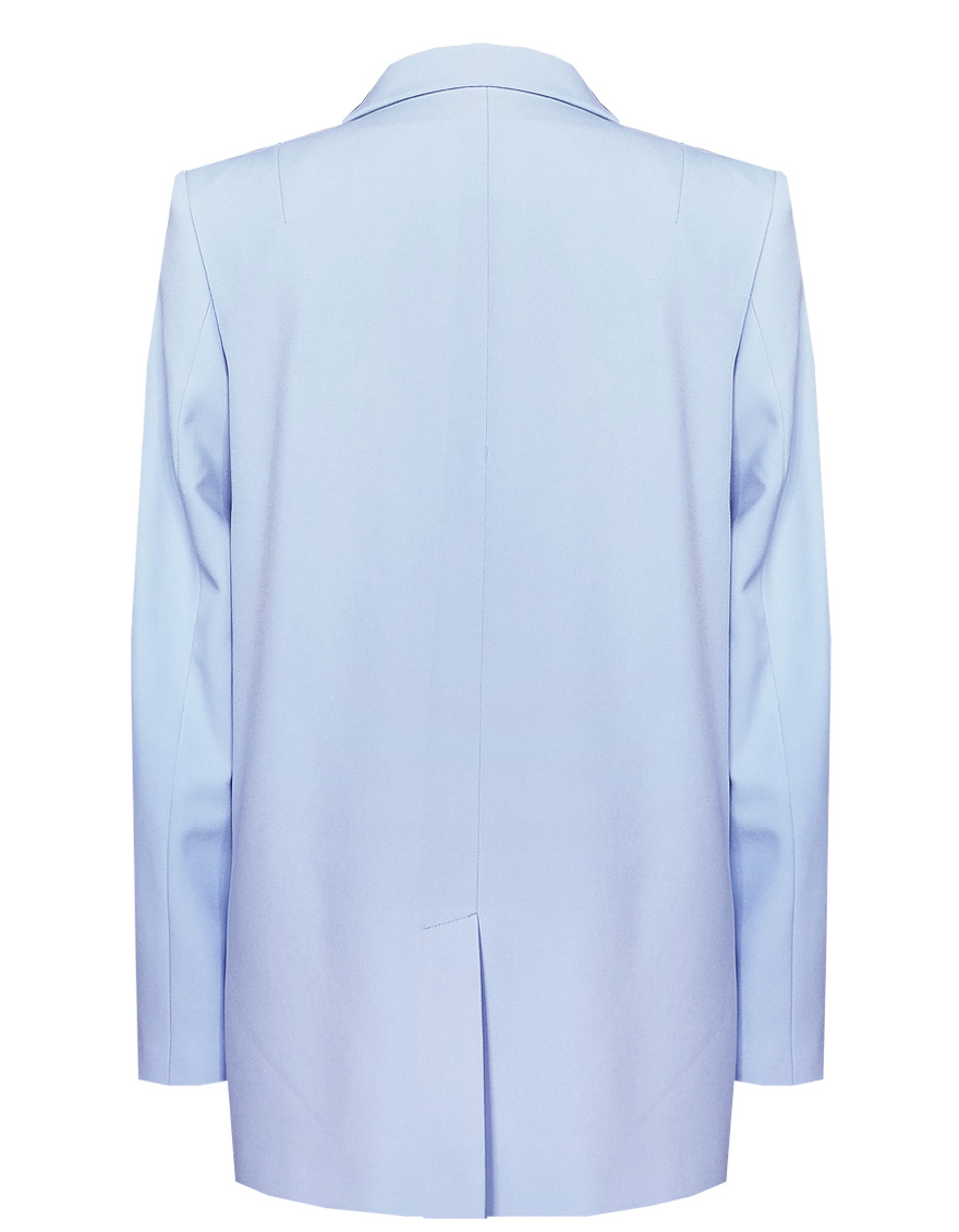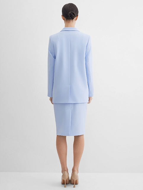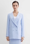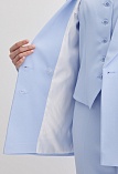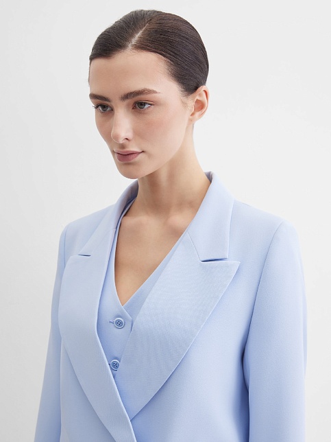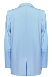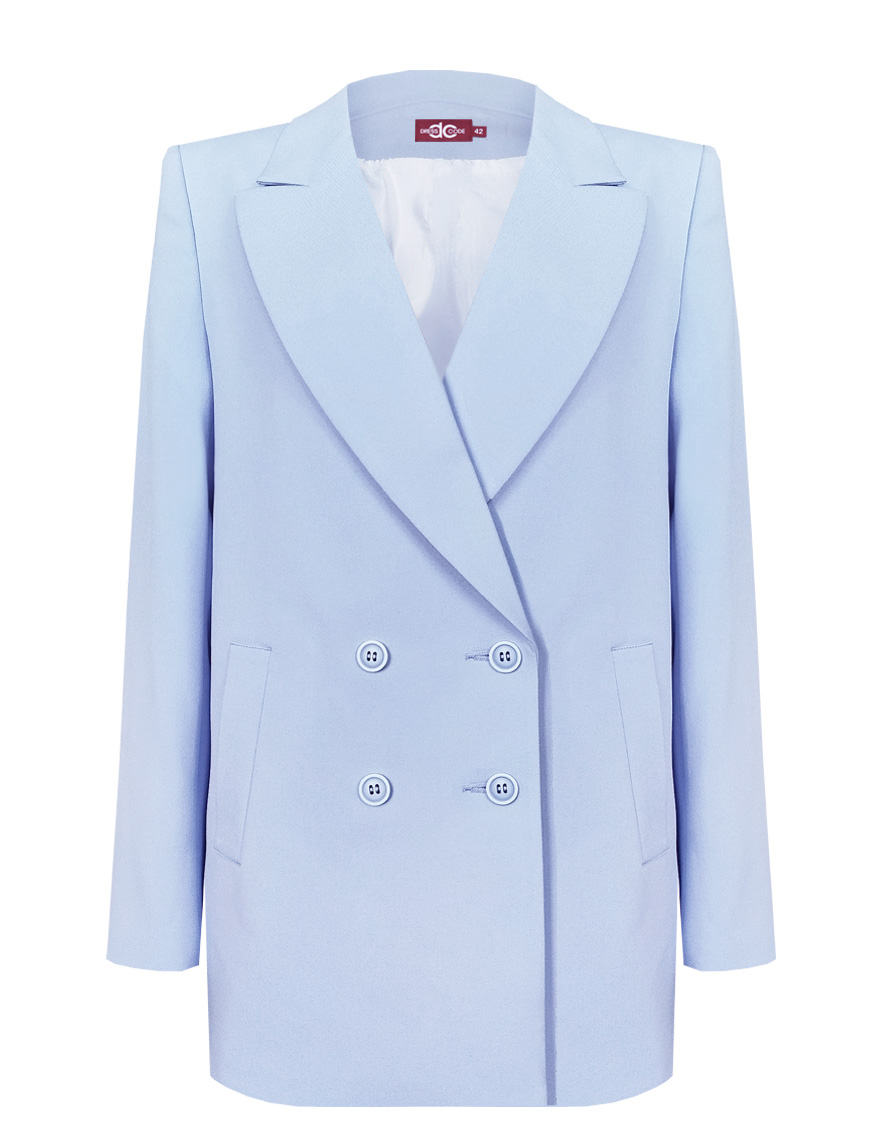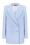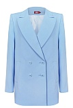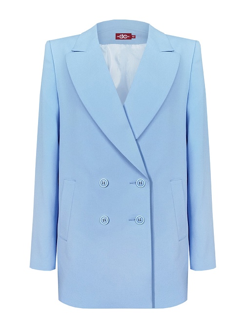 Удлиненный двубортный жакет свободного кроя из поливискозной ткани в сложном, пастельном оттенке голубого с холодным фиолетовым или серым подтоном, который ассоциируется с весной и нежностью, английский воротник, вертикальные прорезные карманы с листочкой, застежка на пуговицы в два ряда, сзади шлица, длинный втачной рукав, тонкие подплечники, модель  полностью на подкладке. Жакет оверсайз без акцента на талии гармонично смотрится на разных типах фигур (миниатюрных, пышных) и для всех возрастов