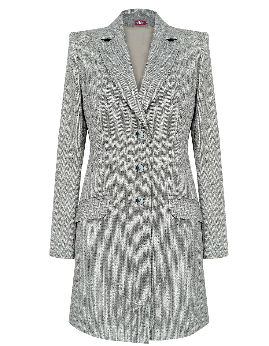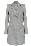 Шерстяной жакет, по фасону напоминающий полупальто, из смесовой ткани с шерстью и классическим твидовым узором "елочка", который напоминает иглы еловых веток, идеальная длина до колена, приталенный, однобортный, английский воротник, прорезные карманы с клапаном, прямой борт, застежка на пуговицы, длинный втачной рукав, тонкие подплечники, модель на подкладке. Ткань с диагональным переплетением обладает высокой прочностью и износостойкостью, а изделие из такой ткани мягкое и удобное.