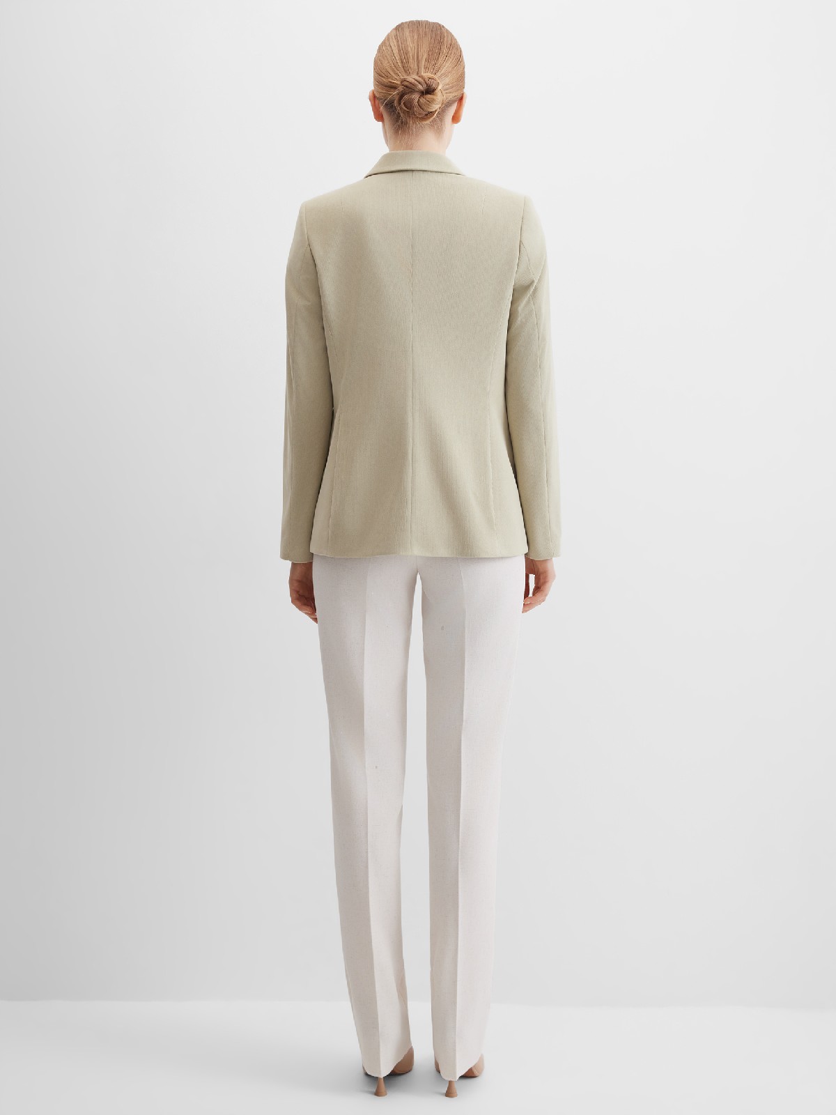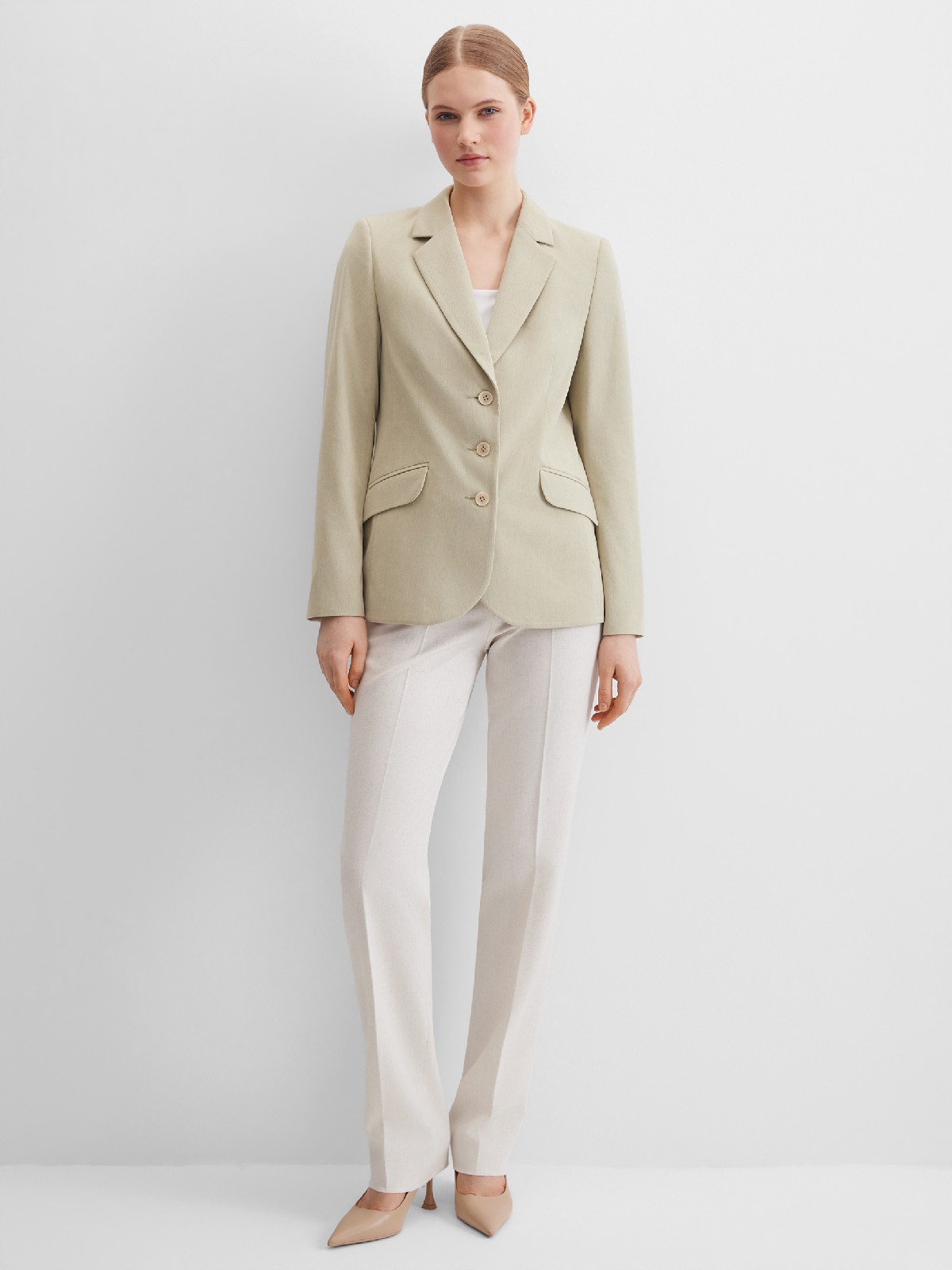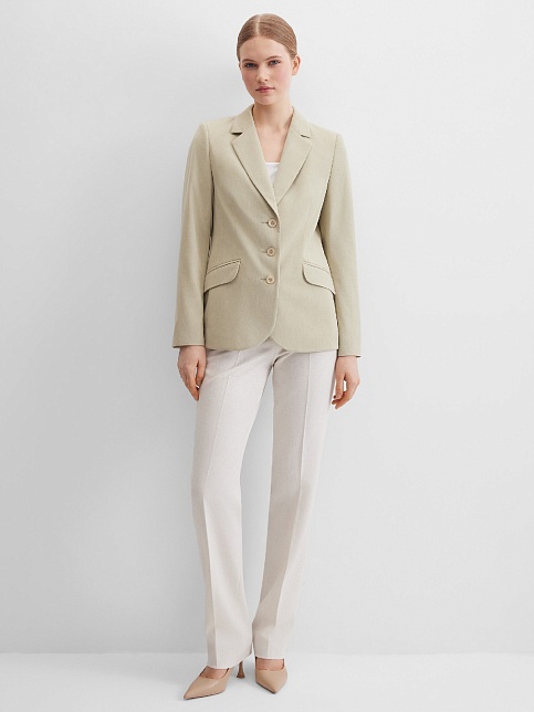 Универсальный классический жакет в спокойном и природном золотисто-оливковом цвете из мягкой и пластичной вельветовой ткани в мелкий продольный рубчик, по своей структуре напоминающий бархат, средняя длина, приталенный, однобортный, английский воротник, прорезные карманы с клапаном, круглый борт, застежка на пуговицы, без шлицы на спинке, длинный втачной рукав, тонкие подплечники, модель полностью на подкладке. Широкий размерный ряд и комфортная посадка на любой размер.
