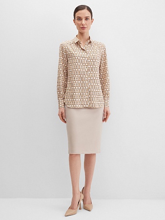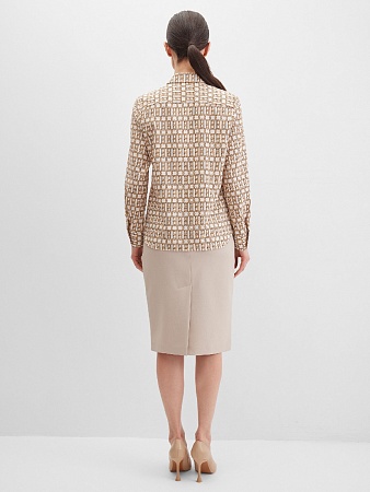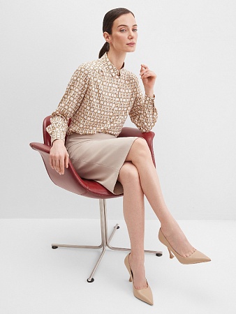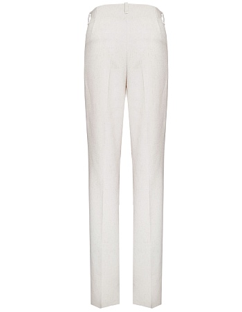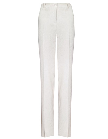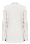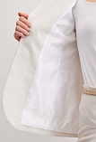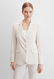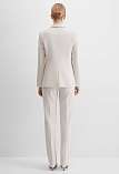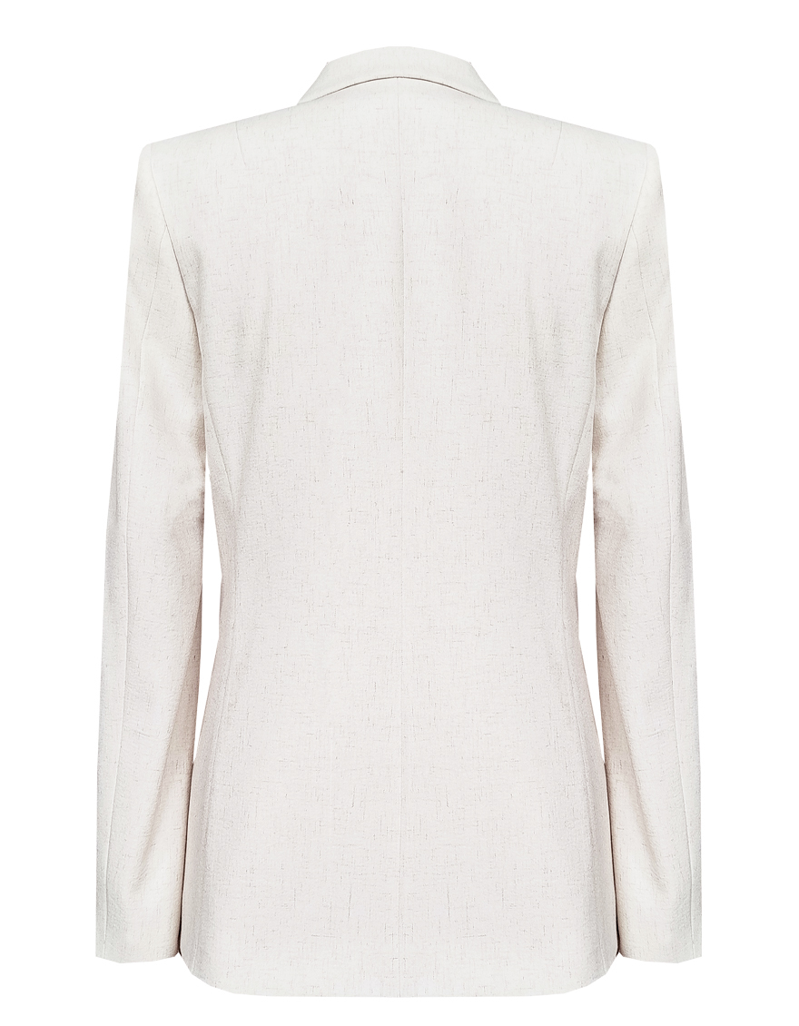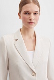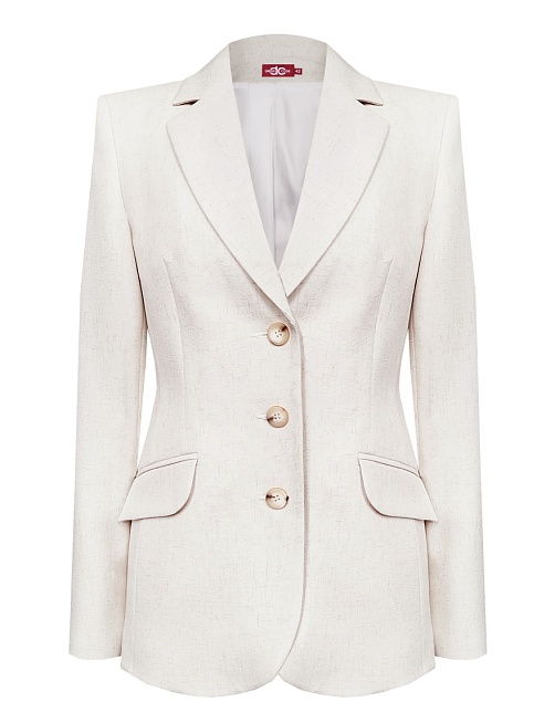 Жакет из поливискозной ткани в мягком жемчужном оттенке с едва заметным переливающимся сиянием перламутрового, создавая кремовое и спокойное настроение, средняя длина, приталенный, однобортный, английский воротник, прорезные карманы с клапаном, круглый борт, застежка на пуговицы, длинный втачной рукав, тонкие подплечники, модель на подкладке. Жакет из такой ткани не так сильно мнется, хорошо держит форму и устойчив к выцветанию, а дышащие свойства поливискозы исключают "парниковый эффект".