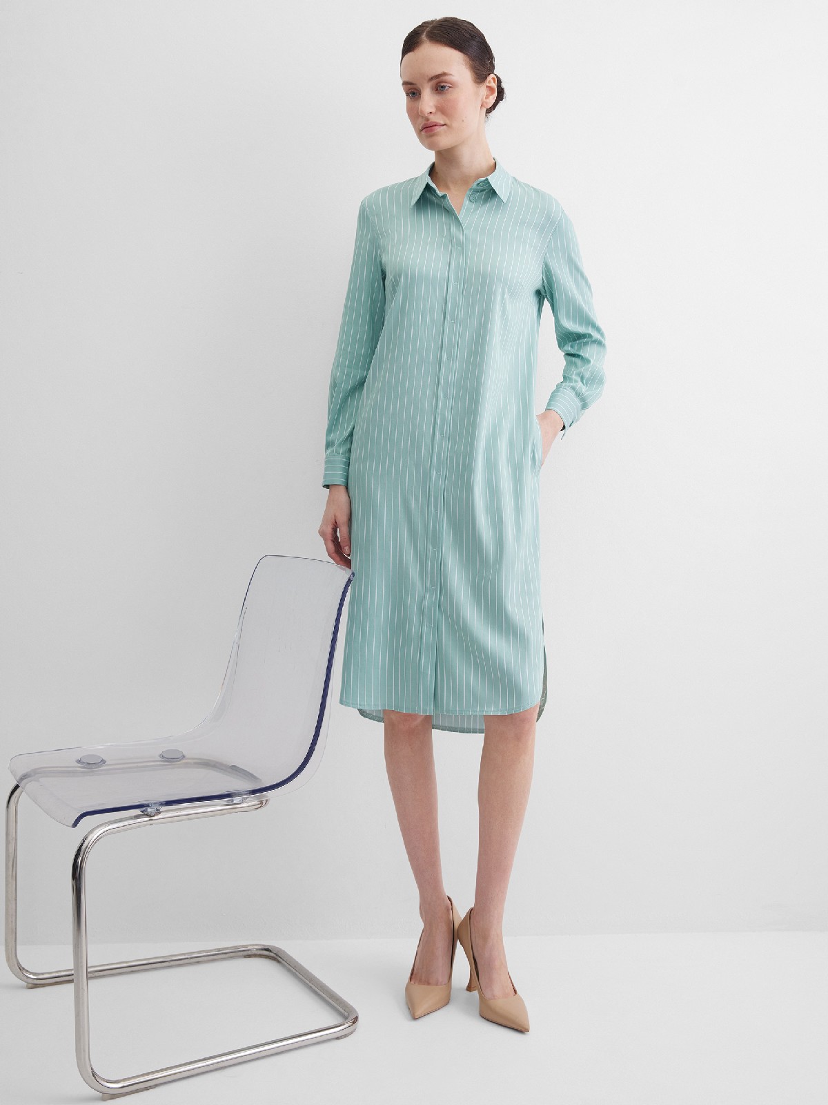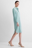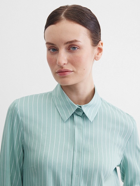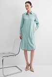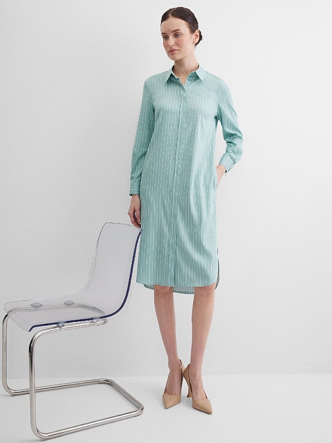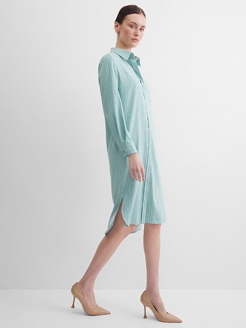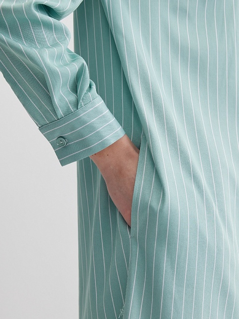 Платье туника или платье блузон из поливискозной ткани в неоново-зеленом цвете в тонкую продольную полоску, представляет из себя нечто среднее между длинной блузкой и платьем миди, свободный крой, отложной воротник, застежка на пуговицы, фигурный низ, втачной рукав 3/4 на узком манжете с функциональной петлей и пуговицей. Это универсальная вешь, которая может быть как самостоятельным нарядом, так и частью ансамбля с брюками или юбкой.