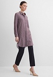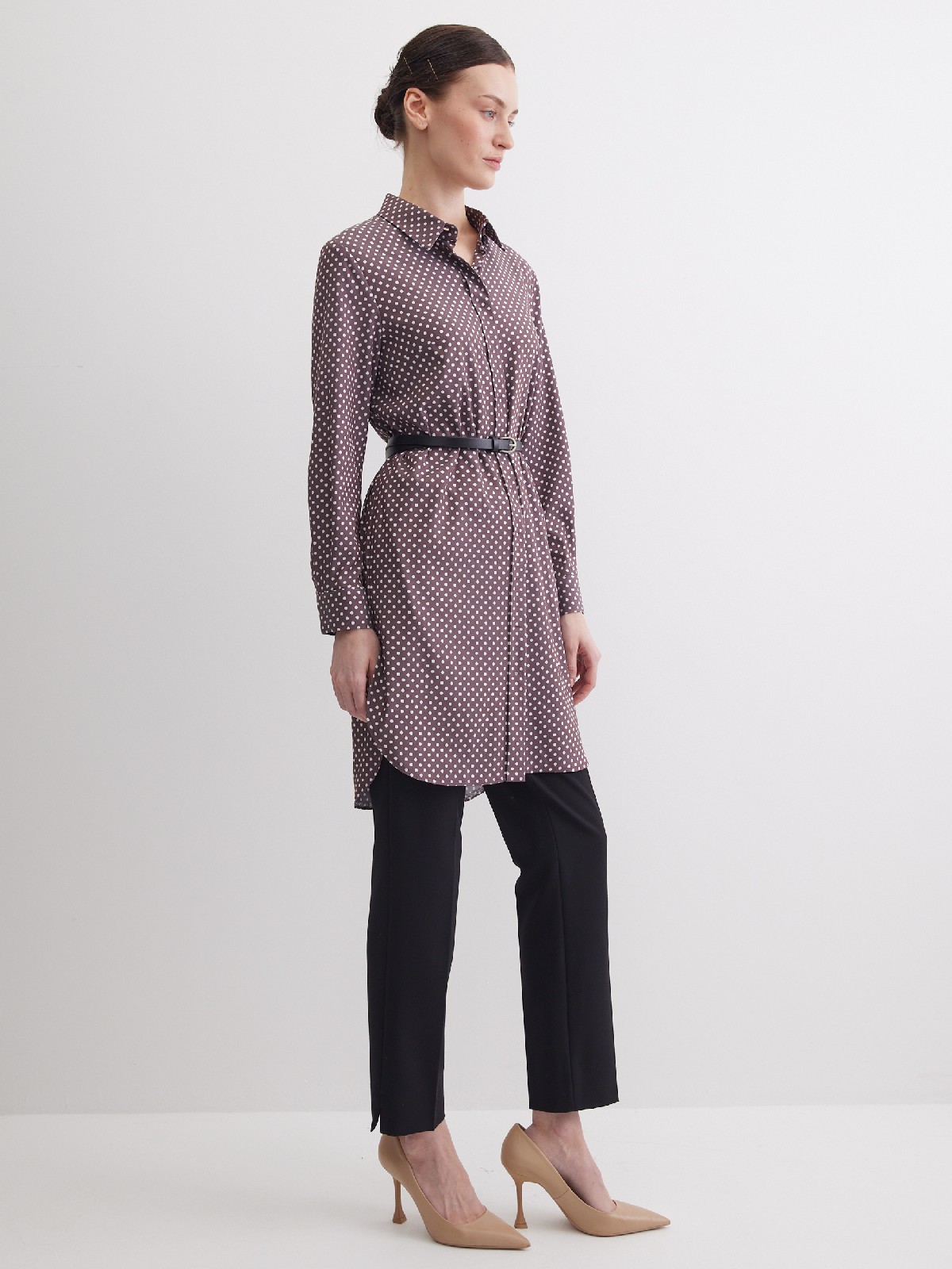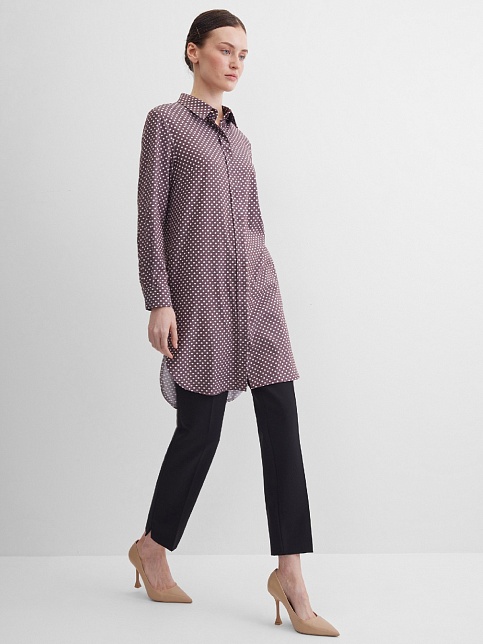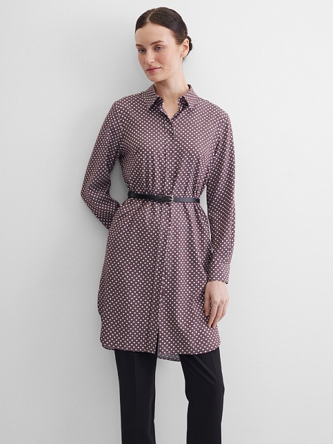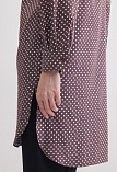 Платье туника или платье блузон из поливискозной ткани с классическим узором "горох", который никогда не выходит из моды и символизирует женственность, модель представляет из себя нечто среднее между длинной блузкой и платьем миди, свободный крой, отложной воротник, застежка на пуговицы, фигурный низ, втачной рукав 3/4 на узком манжете с функциональной петлей и пуговицей. Это универсальная вешь, которая может быть как самостоятельным нарядом, так и частью ансамбля с брюками или юбкой.
