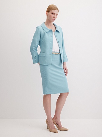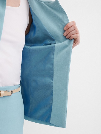 Базовый топ из мягкой поливискозной ткани нежно-голубого цвета под пиджак или как самостоятельное изделие, слегка укорочен от привычной длины  наших базовых топов, приталенный, круглый неглубокий вырез, горловина и проймы обработаны тонким  кантом в цвет основной ткани. Блузочная поливискоза - смесовая ткань, в состав которой входят волокна вискозы и полиэстера, такая ткань приятная на ощупь, долговечна и неприхотлива в уходе.
