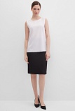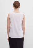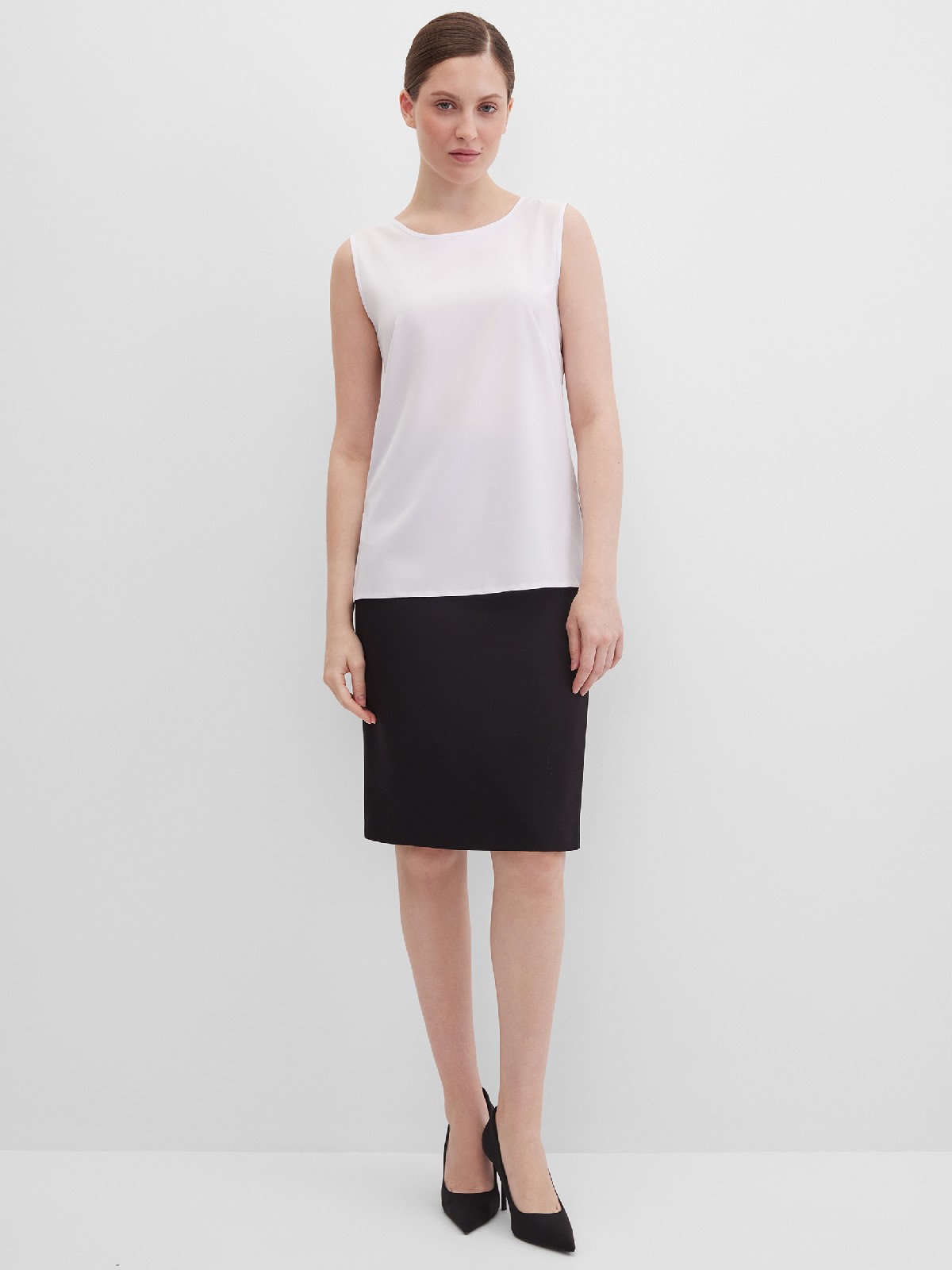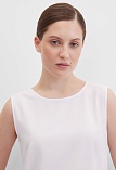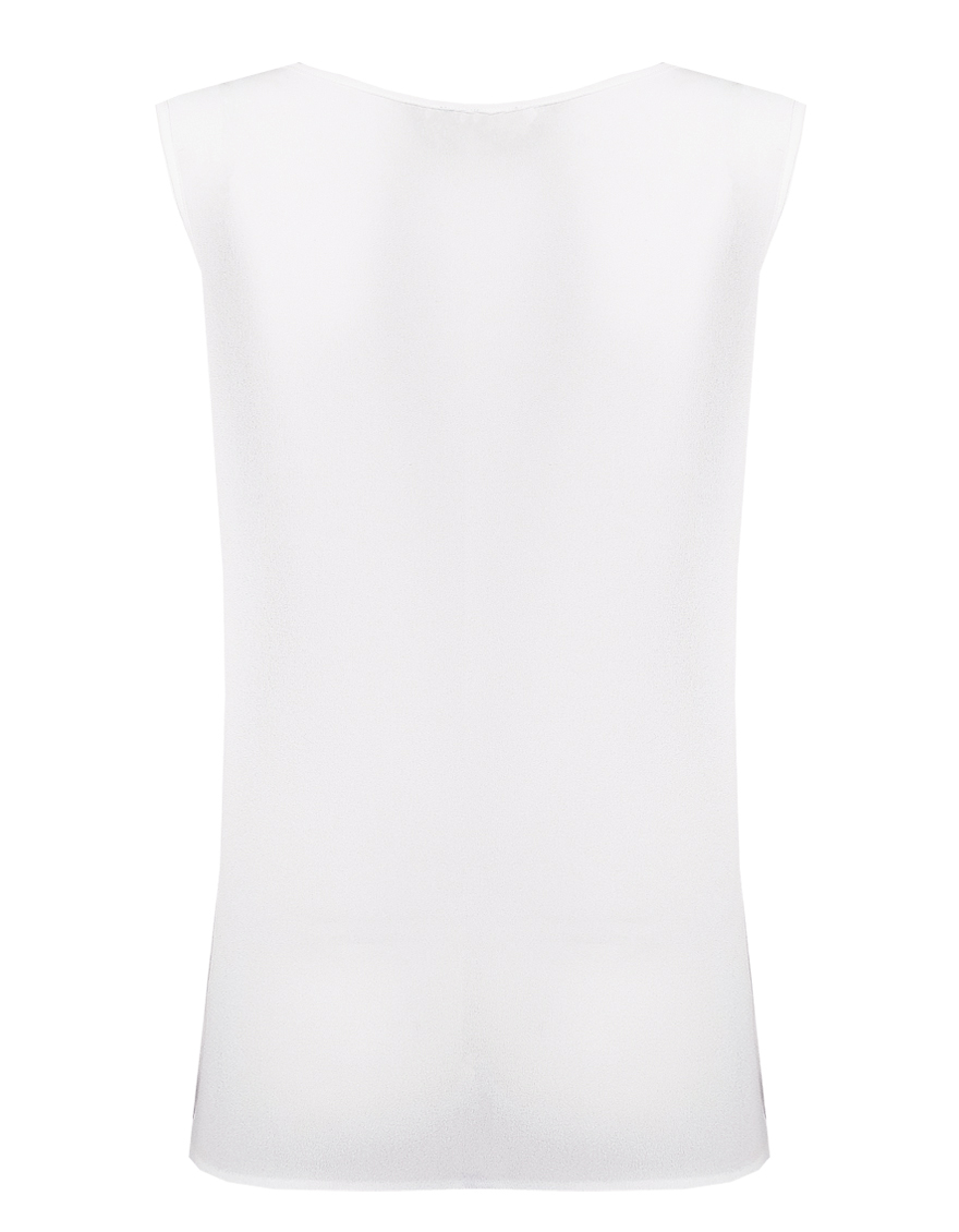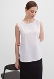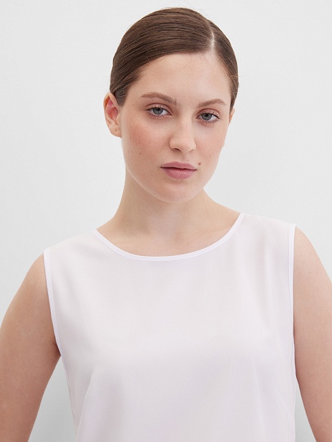 Белоснежный базовый топ из полупрозрачной шифоновой ткани под пиджак или как самостоятельное изделие, приталенный, средняя длина, круглый неглубокий вырез горловины и проймы обработаны узким кантом в цвет основной ткани, по бокам небольшие разрезы для свободы движения и эстетики.