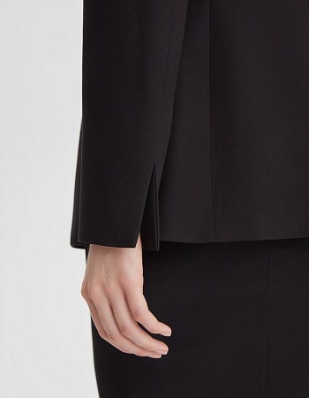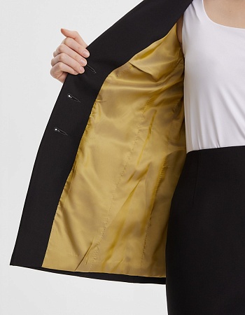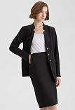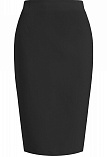 Классическая черная юбка слегка зауженная книзу, на внутренней обтачке без пояса,  посадка средняя, застежка на потайную молнию в среднем шве спинки, сзади шлица, длина юбки миди - до середины колена, модель на подкладке.