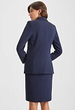 Классическая юбка темно-синего цвета слегка зауженная книзу, на поясе со шлевками под ремень,  посадка средняя, застежка на  молнию и пуговицу в среднем шве спинки, сзади шлица, длина юбки миди - до середины колена, модель на подкладке.