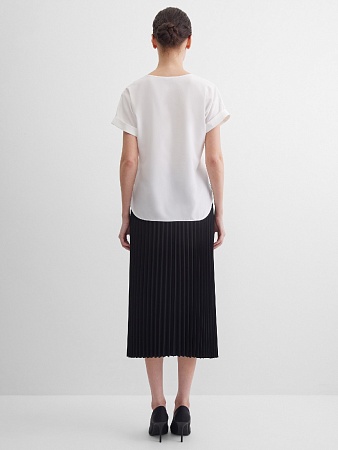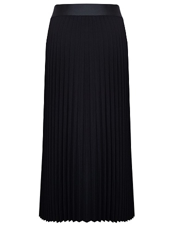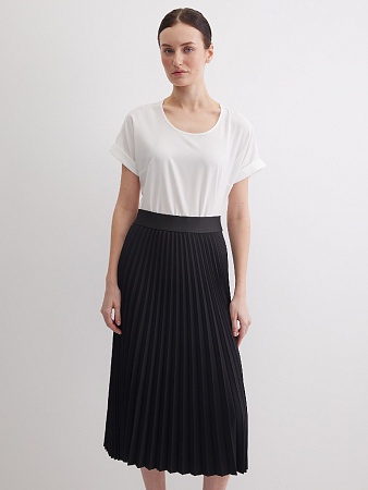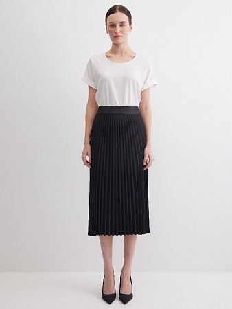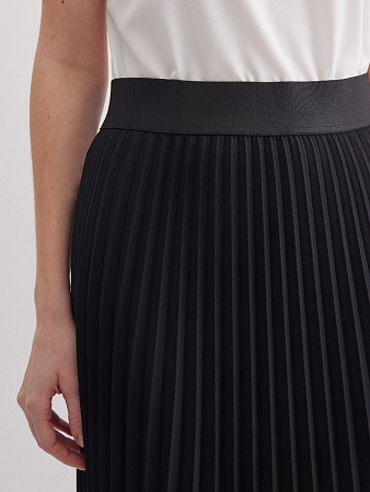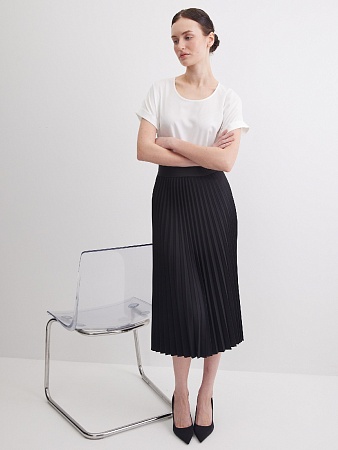 Классическая юбка черного цвета, слегка зауженная книзу, на поясе, посадка средняя, застежка на  молнию и пуговицу в среднем шве спинки, сзади шлица, длина юбки миди - до середины колена, модель на подкладке.