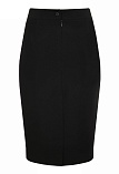 Классическая юбка черного цвета, слегка зауженная книзу, на поясе,  посадка средняя, застежка на  молнию и пуговицу в среднем шве спинки, сзади шлица, длина юбки миди - до середины колена, модель на подкладке.