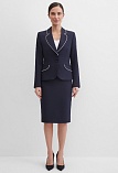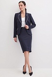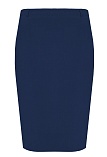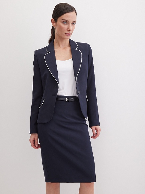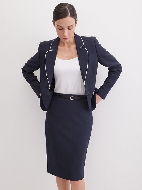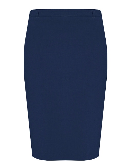 Классическая юбка благородного синего цвета из поливискозной ткани слегка зауженная книзу, на поясе со шлевками под ремень, посадка средняя, застежка на молнию и пуговицу в среднем шве спинки, сзади шлица, длина юбки миди - до середины колена, модель на подкладке.