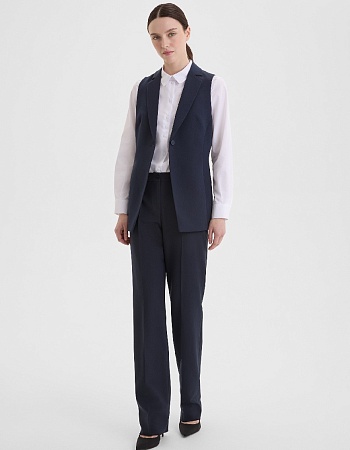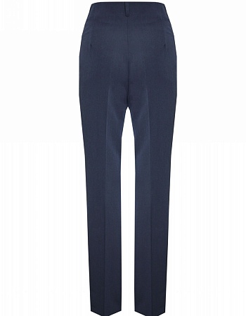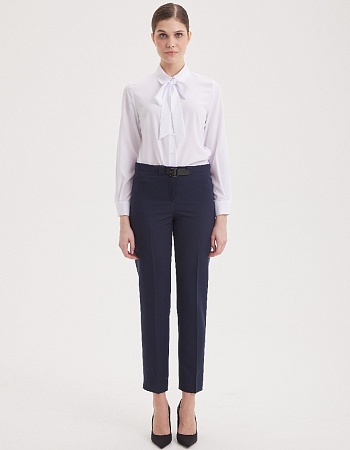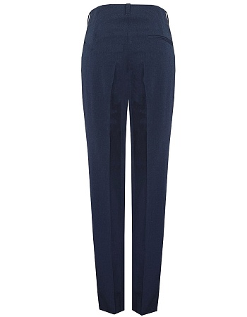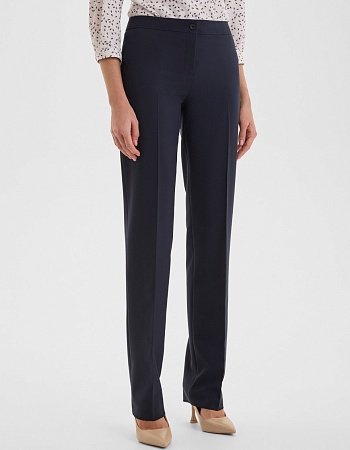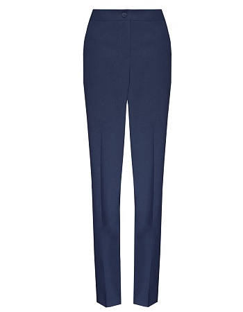 Классическая юбка темно-синего цвета из поливискозной ткани слегка зауженная книзу, на поясе со шлевками под ремень, посадка средняя, застежка на молнию и пуговицу в среднем шве спинки, сзади шлица, длина юбки миди - до середины колена, модель на подкладке. Поливискозная ткань - смесовая ткань, в состав которой входят волокна вискозы и полиэстера. Именно полиэстер придает ткани прочность, долговечность и опрятный внешний вид.