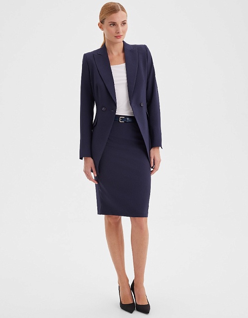 Классическая юбка в благородном и элегантном синем цвете из поливискозной ткани, слегка зауженная книзу, на поясе со шлевками под ремень, посадка средняя, застежка на молнию и пуговицу в среднем шве спинки, сзади шлица, длина юбки миди - до середины колена, модель на подкладке. Поливискозная ткань - смесовая ткань, в состав которой входят волокна вискозы и полиэстера. Именно полиэстер придает ткани прочность и материал практически не подвержен стиранию.