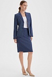 Классическая юбка из костюмной поливискозной ткани синего цвета с переплетением темных и светлых нитей, такое решение придает ткани легкий меланжевый эффект, а изделию уникальный внешний вид. Модель на поясе,  слегка зауженная книзу, посадка средняя, застежка на  молнию и пуговицу в среднем шве спинки, сзади шлица, длина юбки миди - до середины колена, модель на подкладке. Поливискозная ткань - смесовая ткань, в состав которой входят волокна вискозы и полиэстера.