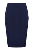 Классическая юбка из поливискозной ткани темно-синего цвета в тонкую, почти невидимую полоску, слегка зауженная книзу, на внутренней обтачке без пояса, посадка средняя, застежка на потайную молнию в среднем шве спинки, сзади шлица, длина юбки миди - до середины колена, модель на подкладке. Поливискозная ткань - смесовая ткань, в состав которой входят волокна вискозы и полиэстера. Именно полиэстер придает ткани прочность, долговечность и опрятный внешний вид.