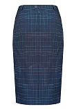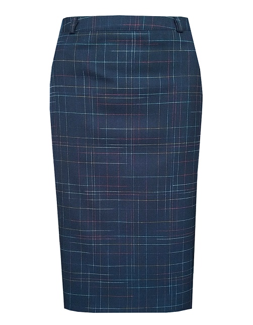 Классическая юбка слегка зауженная книзу темно-синего цвета из костюмной поливискозной ткани в тонкую, почти незаметную разноцветную клетку, на поясе со шлевками под ремень, посадка средняя, застежка на потайную молнию и пуговицу в среднем шве спинки, сзади шлица, длина юбки миди - до середины колена, модель на подкладке. Поливискозная ткань - смесовая ткань, в состав которой входят волокна вискозы и полиэстера. Именно полиэстер придает ткани прочность, долговечность и опрятный внешний вид.