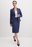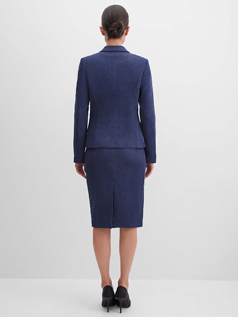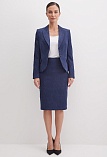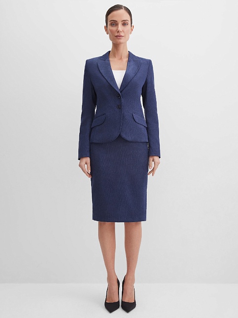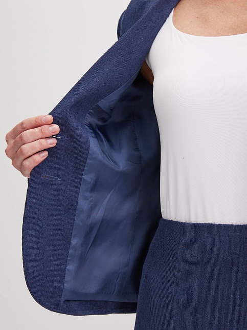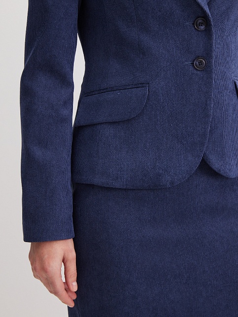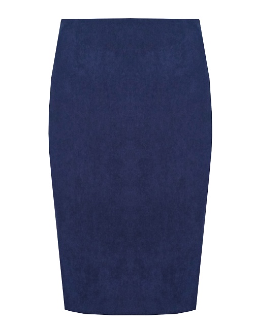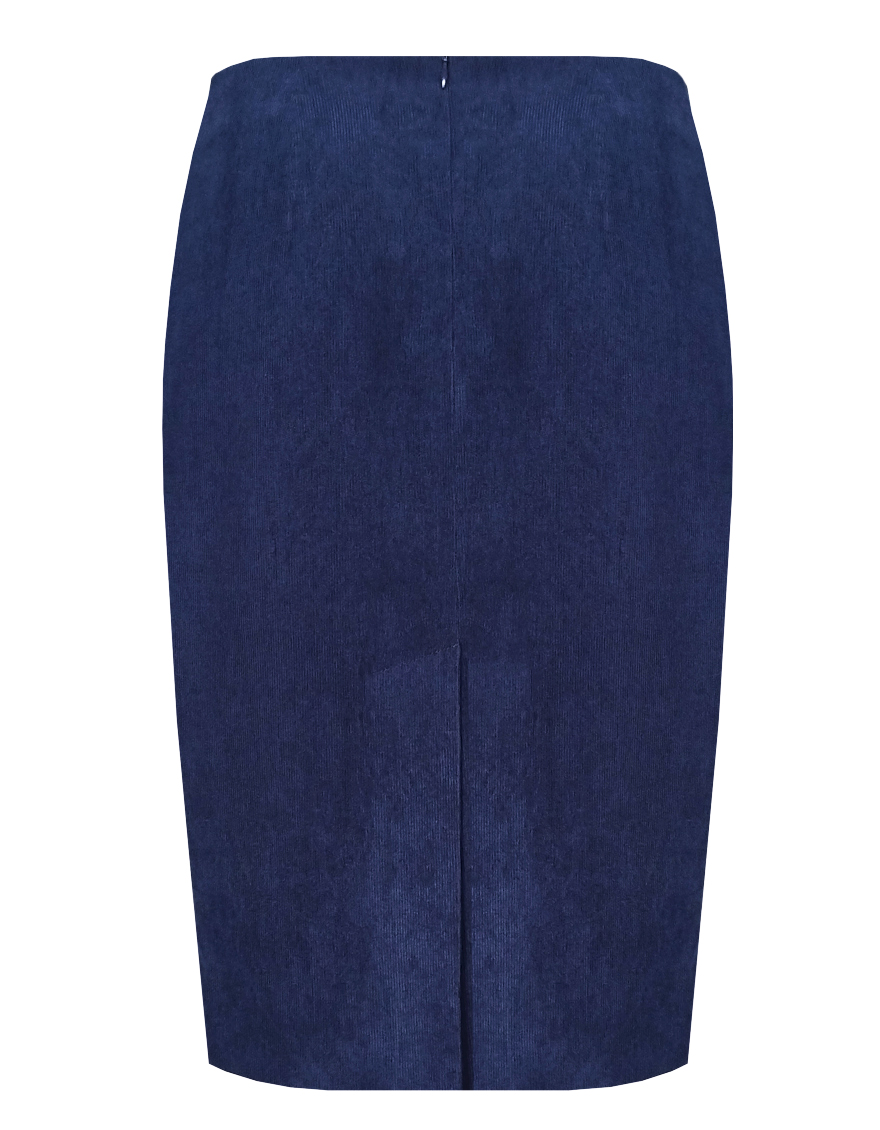 Классическая юбка из микровельвета в рубчик синего цвета слегка зауженная книзу, на внутренней обтачке без пояса,  посадка средняя, застежка на потайную молнию в среднем шве спинки, сзади шлица, длина юбки миди - до середины колена, модель на подкладке.