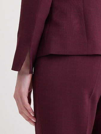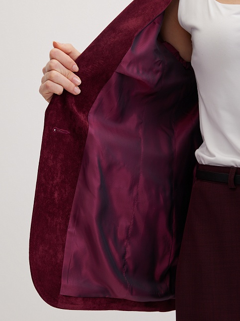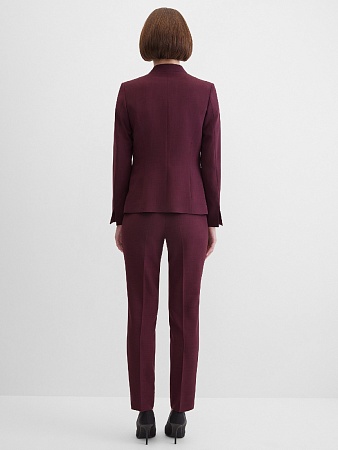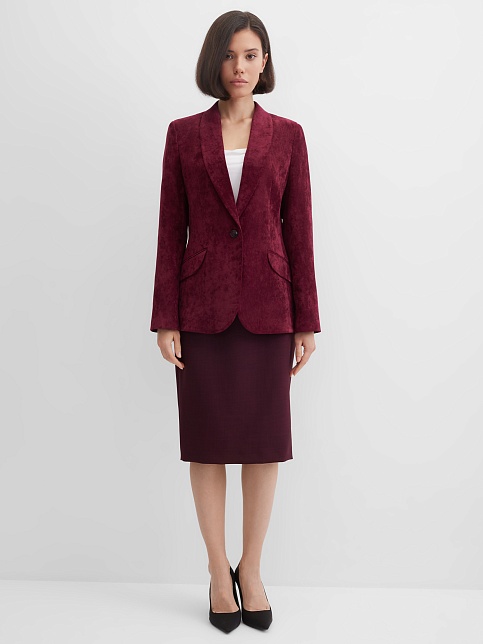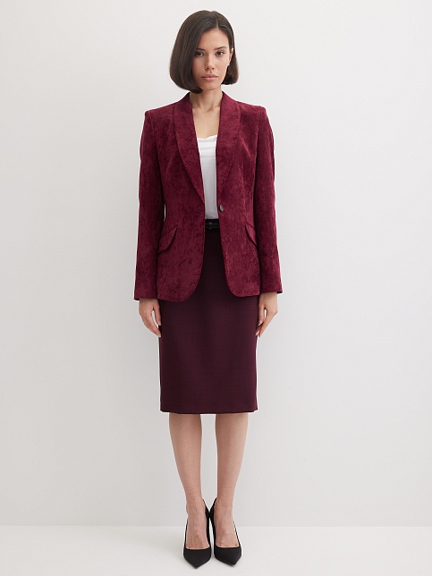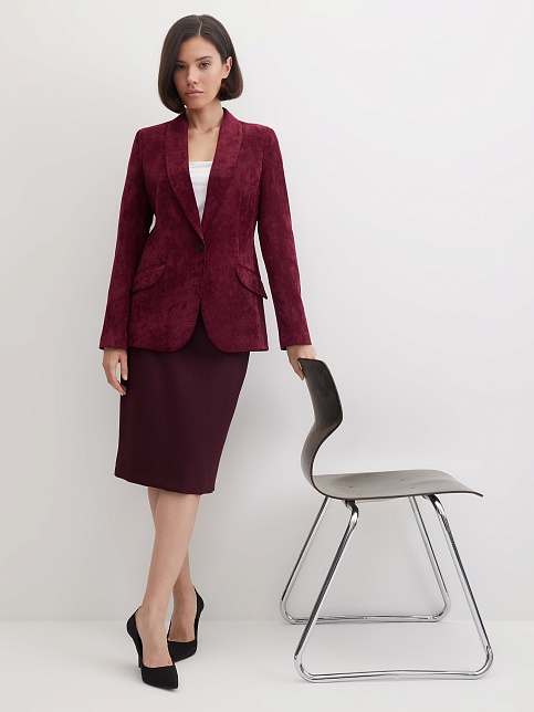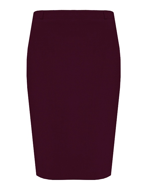 Классическая юбка из поливискозной ткани в глубоком и насыщенном оттенке винного цвета, который сочетает в себе тепло красного, благородство бордового и интригу фиолетового, слегка зауженная книзу, на поясе со шлевками под ремень, посадка средняя, застежка на молнию и пуговицу в среднем шве спинки, сзади шлица, длина юбки миди - до середины колена, модель на подкладке. Поливискозная ткань - смесовая ткань, в состав которой входят волокна вискозы и полиэстера.