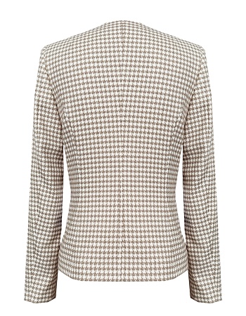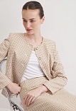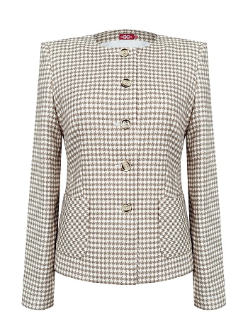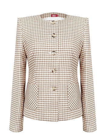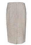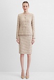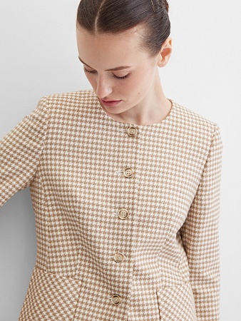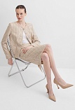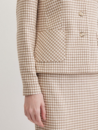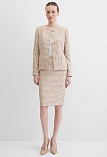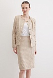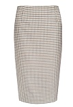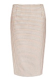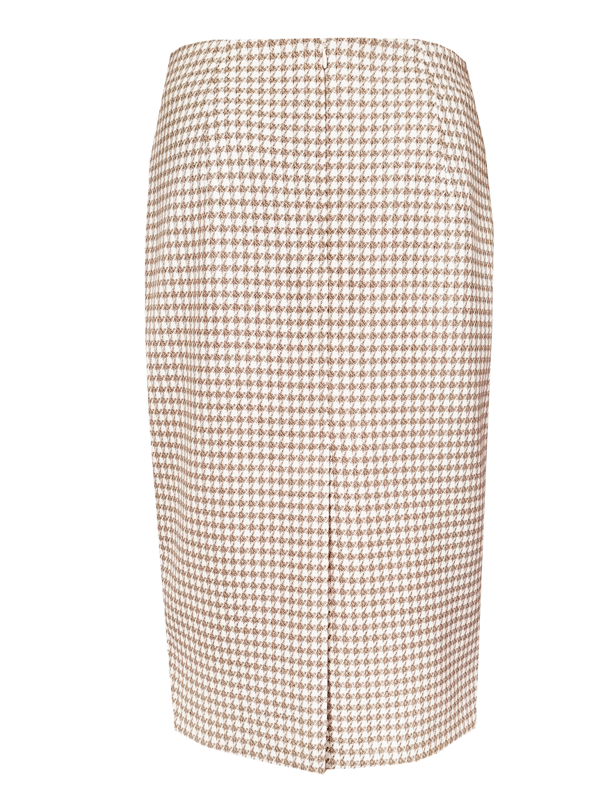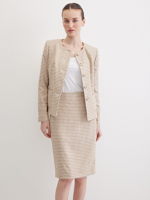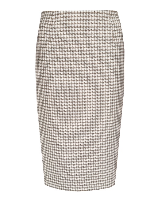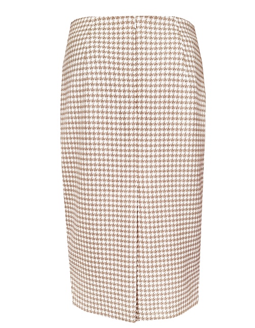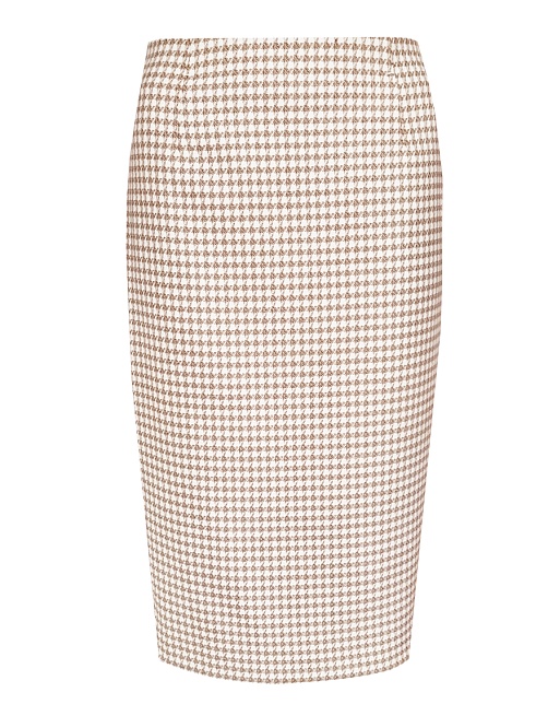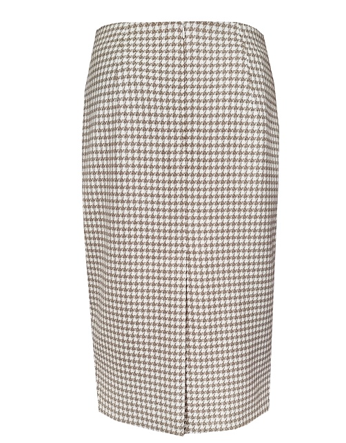 Классическая юбка с двухцветным геометрическим орнаментом пье де пуль ("гусиная лапка") в бежевом оттенке из поливискозной ткани, слегка зауженная книзу, на внутренней обтачке без пояса, посадка средняя, застежка на потайную молнию в среднем шве спинки, сзади шлица, длина юбки миди - до середины колена, модель на подкладке. Поливискозная ткань - смесовая ткань, в состав которой входят волокна вискозы и полиэстера. Именно полиэстер придает ткани прочность, долговечность и опрятный внешний вид.