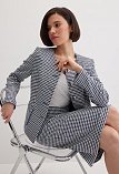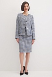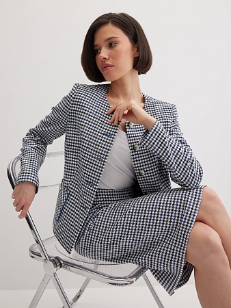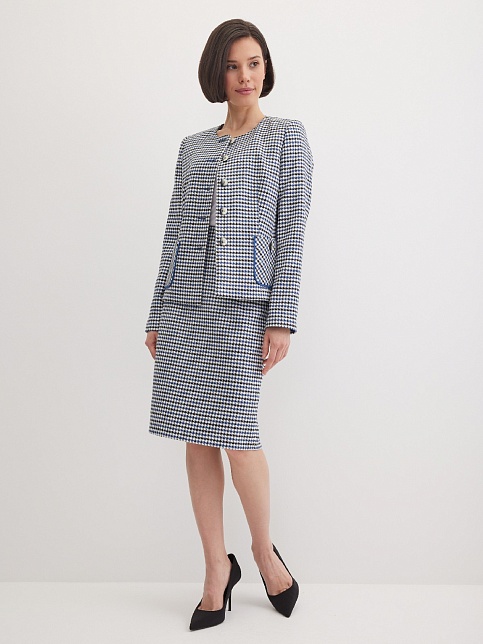 Классическая юбка из трехцветной поливискозной ткани с одним из самых неподвластных времени культовых узоров в моде "гусиная лапка" (пье-де-пуль) - геометрический орнамент из повторяющихся рядов ломаных клеток, слегка зауженная книзу, без пояса, на внутренней обтачке, посадка средняя, застежка на потайную молнию в среднем шве спинки, сзади шлица, длина юбки миди - до середины колена, модель на подкладке. Поливискозная ткань - смесовая ткань, в состав которой входят волокна вискозы и полиэстера.