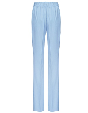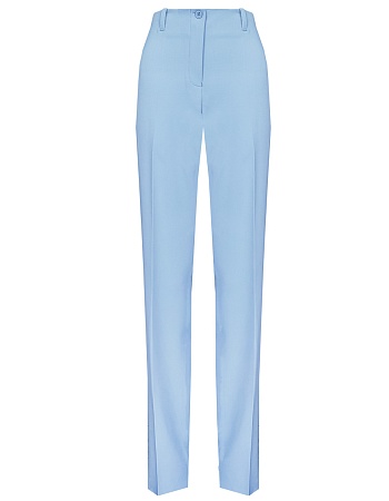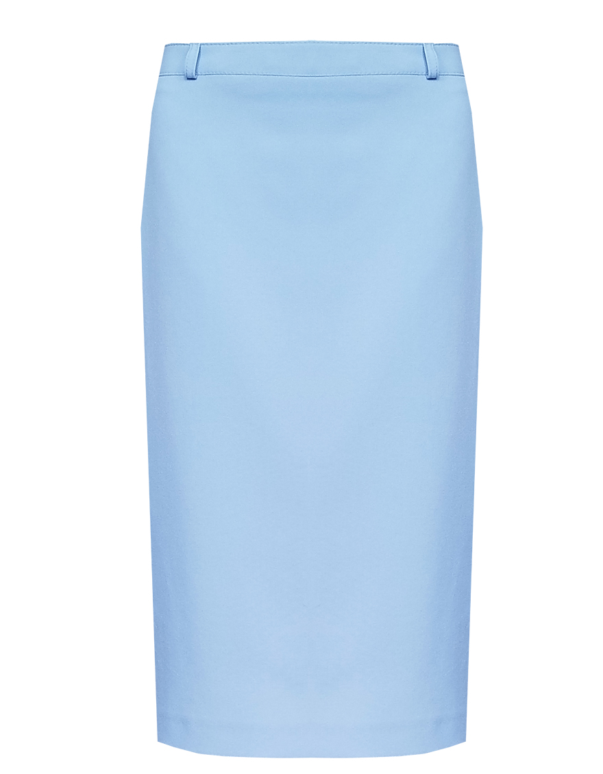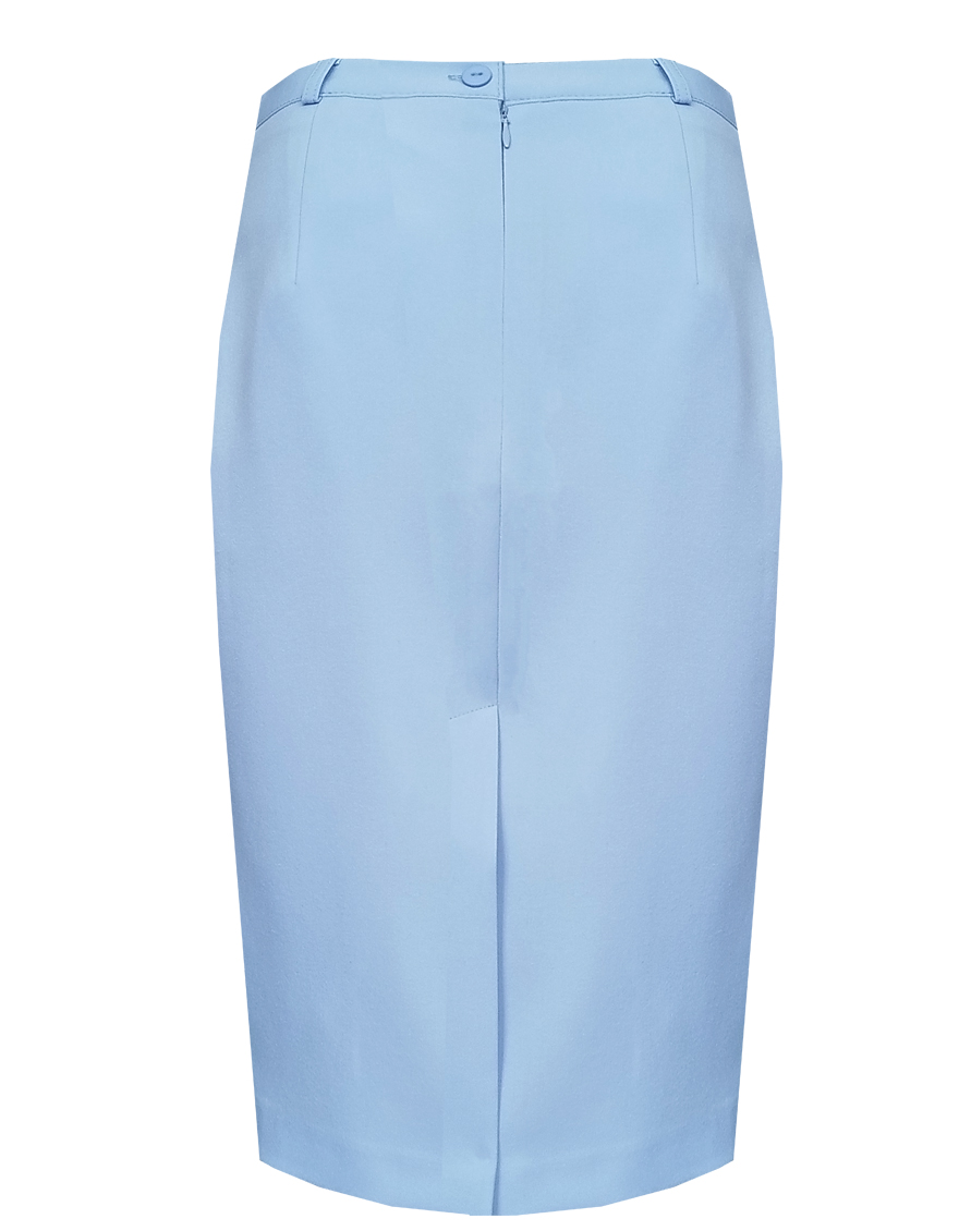Классическая юбка прямого кроя слегка зауженная книзу из поливискозной ткани в сложном, пастельном оттенке голубого с холодным фиолетовым или серым подтоном, который ассоциируется с весной и нежностью, на поясе со шлевками под ремень, посадка средняя, застежка на потайную молнию и пуговицу в среднем шве спинки, сзади шлица для удобства при ходьбе, длина юбки миди - до середины колена, модель на подкладке.