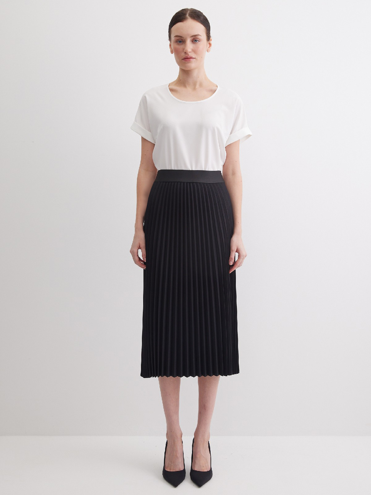 Черная юбка плиссе из поливискозной ткани с мягкими складками, создающие объем, традиционный пояс по талии заменила эластичная резинка, которая отлично тянется, позволяет легко надеть юбку, не стесняет движений и делает ее идеальной для повседневной носки, без застежки, длина юбки макси - ниже колена, модель без подкладки. Она универсальна, подходит для многих типов фигур и любого сезона. Классический, универсальный вариант для офиса.