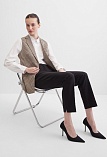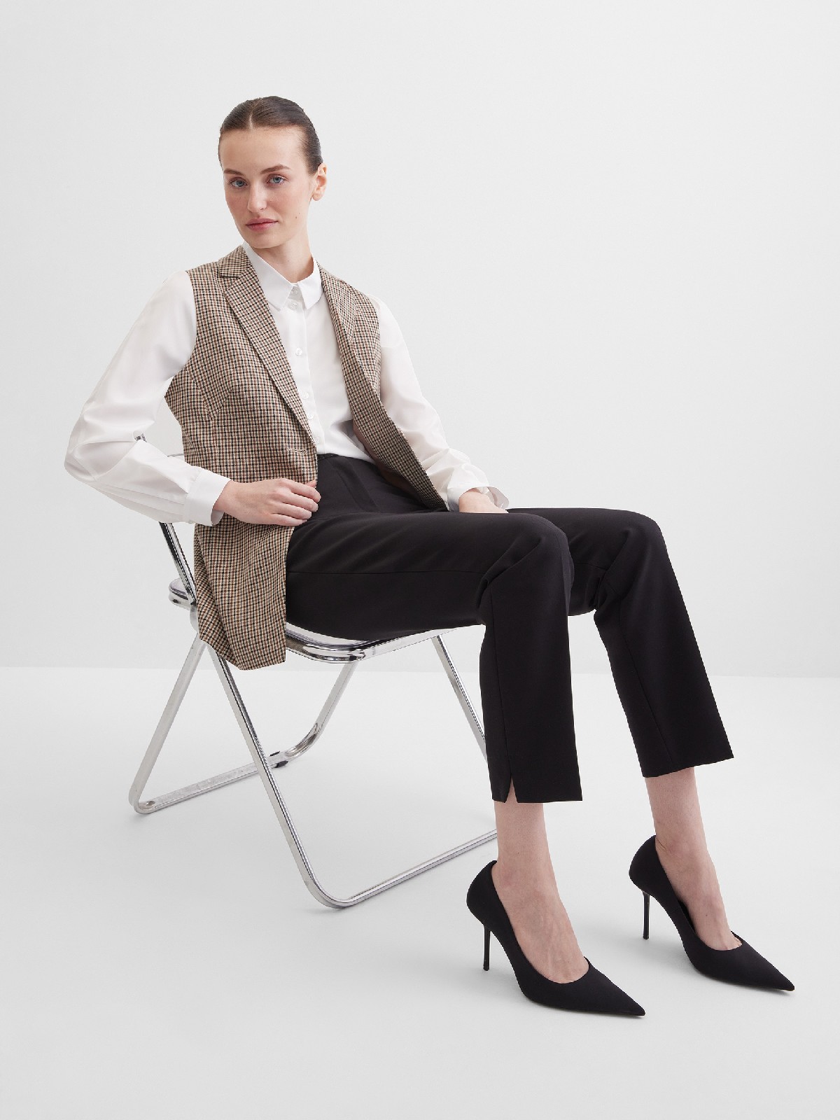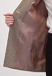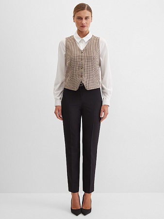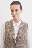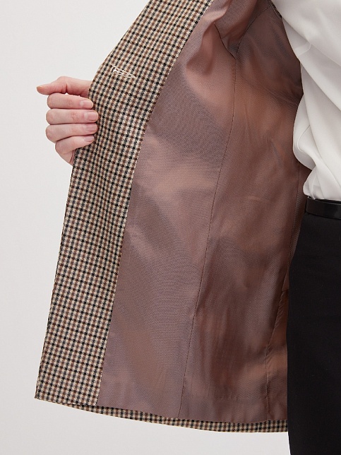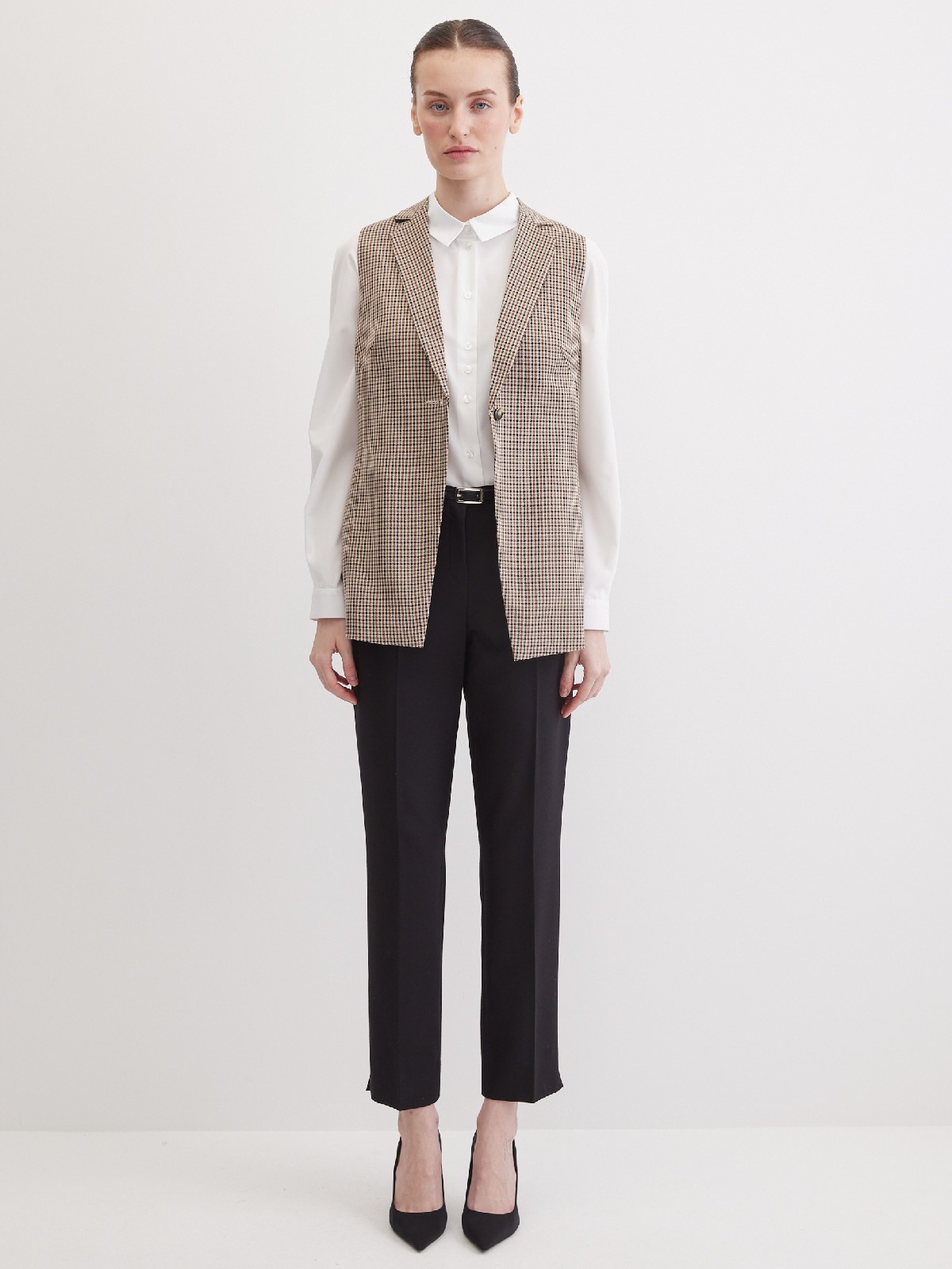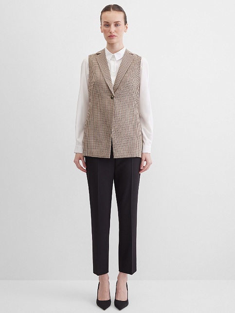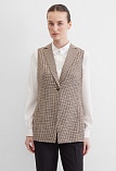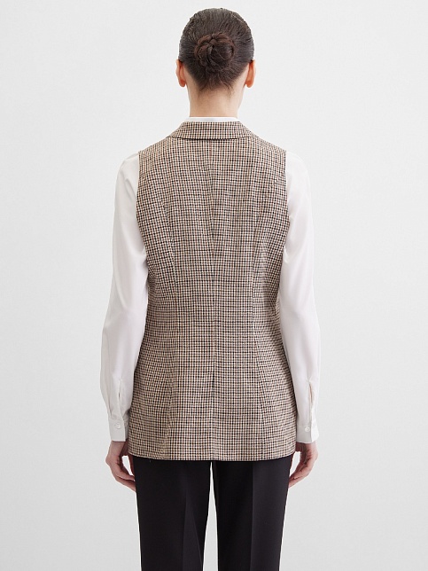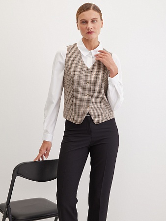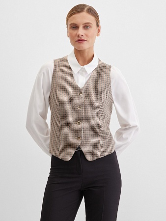 Стильный жилет в клетку в классической и элегантной цветовой гамме: песочный, коричневый и черный. Песочный добавляет теплоту, коричневый благородство, а черный строгость и выразительность, такое сочетание подходит для создания стильного и утонченного образа. Комфортная длина  прикрывающая бедра, приталенный, однобортный, английский воротник, внутренние карманы в рельефе почти незаметны, застежка на одну пуговицу, модель на подкладке. Модель выполнена из поливискозной ткани.